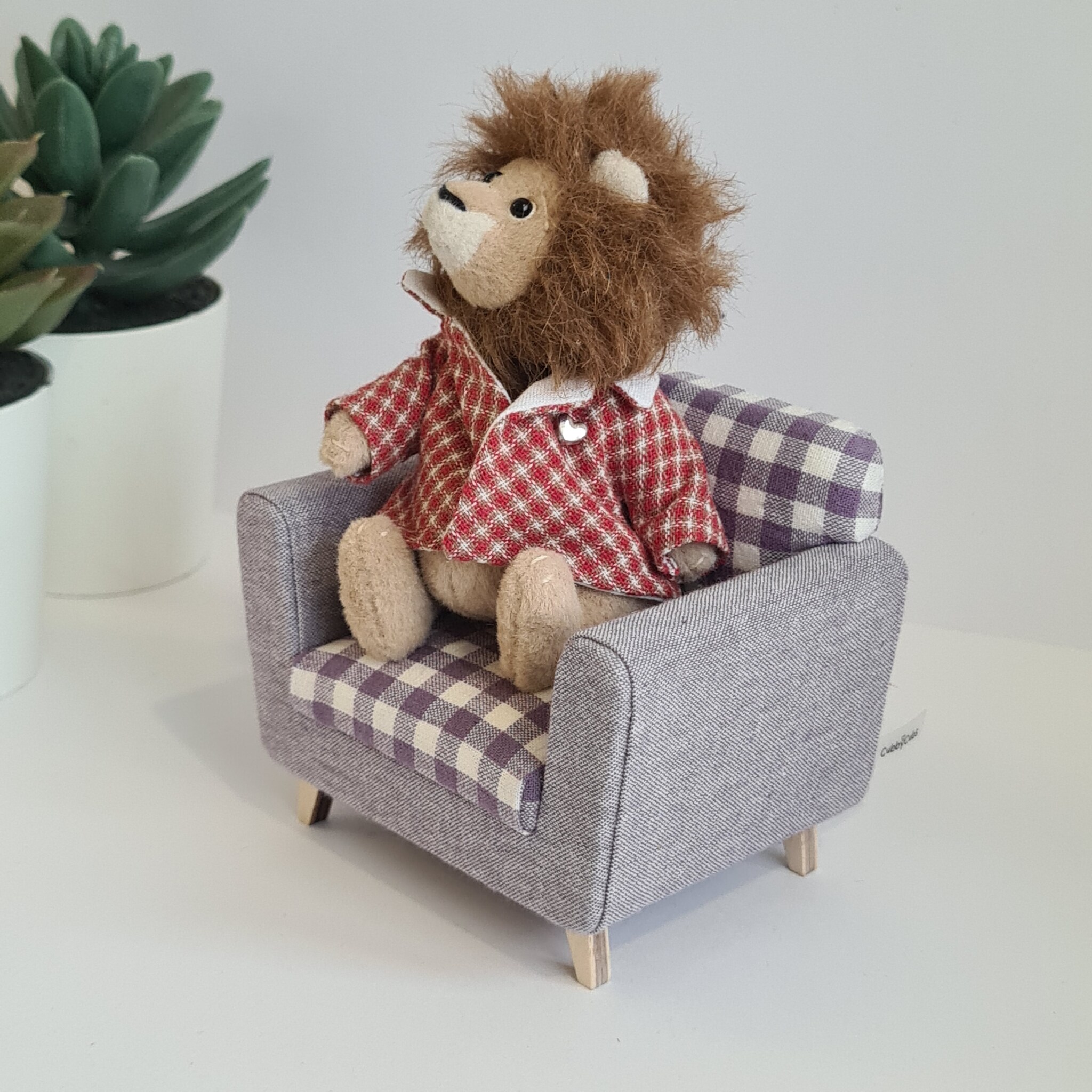 Кресло: 8х6х8см, материалы: фанера, хлопок, поролон, иск.замша, клей.