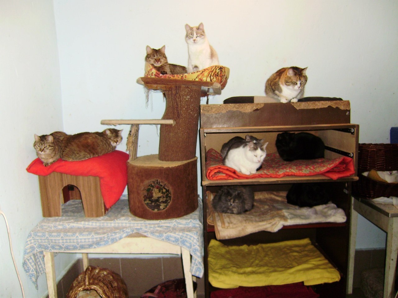 Приют состоит из основного дома. Там карантинный вольер,комната работников и кошачий дом. Зимой коты живуи на пепвом этаже в небольшой комнате. Там каменные сиены и обогрев. Как только теплеет,они переезжают на мансарду. Там две комнаты в их полном распоряжении.