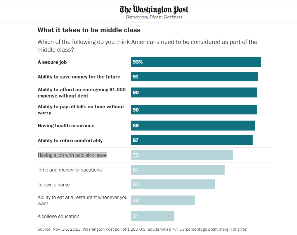 Наткнулась на интересную статью в Washington Post, в которой приводится опрос на тему основных признаков среднего класса. Результаты такие: