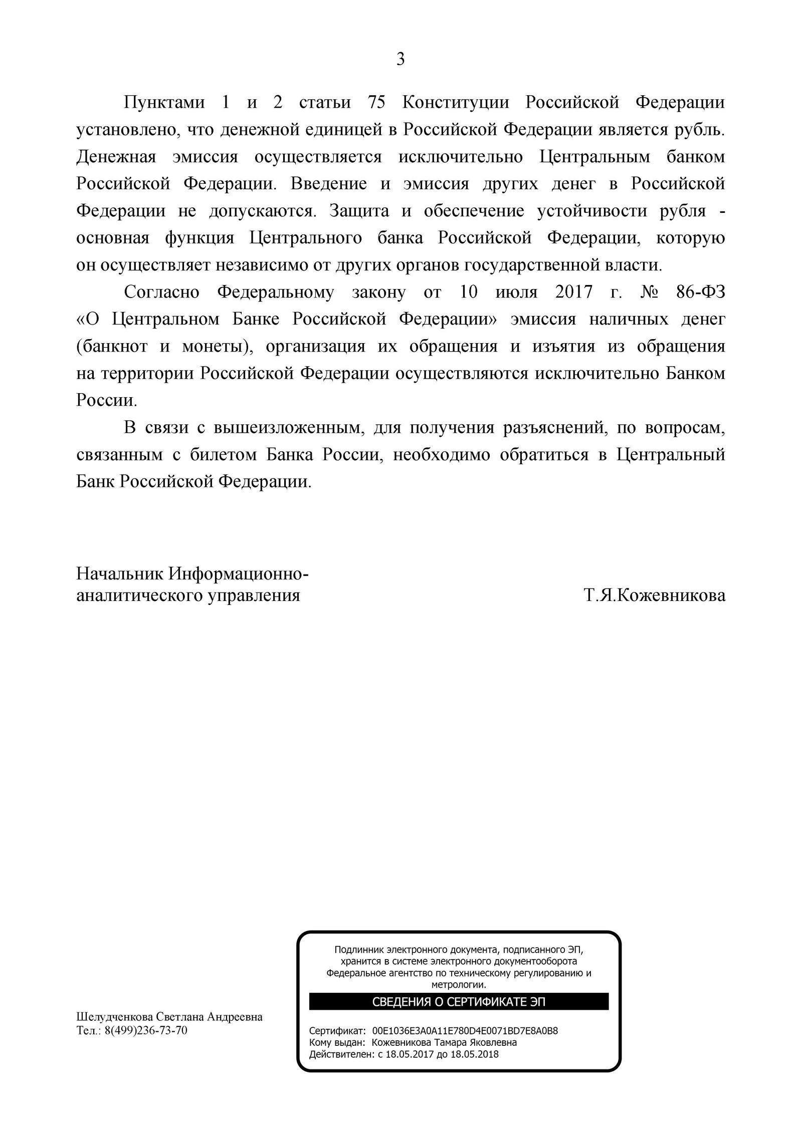 Самое интересное начинается со слов: «По вопросам 5, 6 и 7…», где сказано: «По вопросам 5, 6 и 7 Вашего обращения Управление сообщает: билет Банка России не имеет классификации в соответствии с ОКВ». Теперь берем любую бумажную купюру Банка России и смотрим в верхний правый угол с надписью: «Билет Банка России». Смотрим в документ, смотрим в купюру, проверяем не поддельная ли купюра (купюра не поддельная) и понимаем, что если наша денюшка не имеет классификации в соответствии с ОКВ, то как вообще мы расплачиваемся эти деньгами? Идем в консультант + и согласно пунктам 1 и 2 статьи 75 Конституции Российской Федерации установлено, что денежной единицей в Российской Федерации является рубль