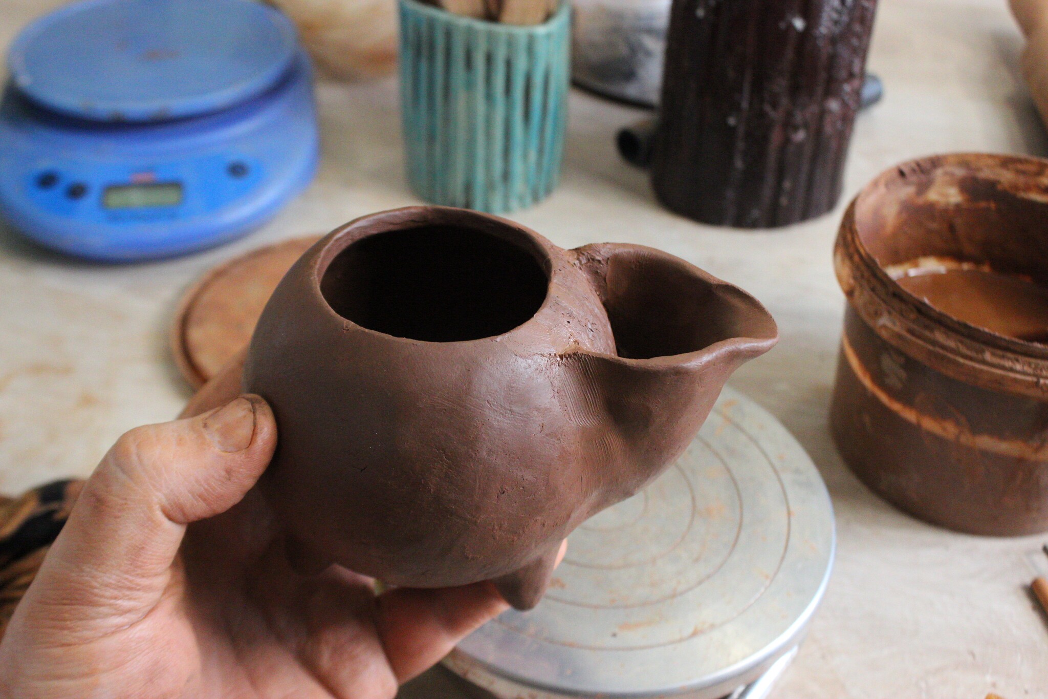 Лепится открытый носик просто - из пласта или комка вам нужно получить широкий треугольник. Отформовать его и приклеить. Пласт не должен сильно отличаться по толщине от стенки чайника. Если стенка 0,5 см. , то носик не должен быть тоньше 0,3. На нескольких моих чайниках тонкостенные носики очень сильно повело в сторону после утильного обжига.