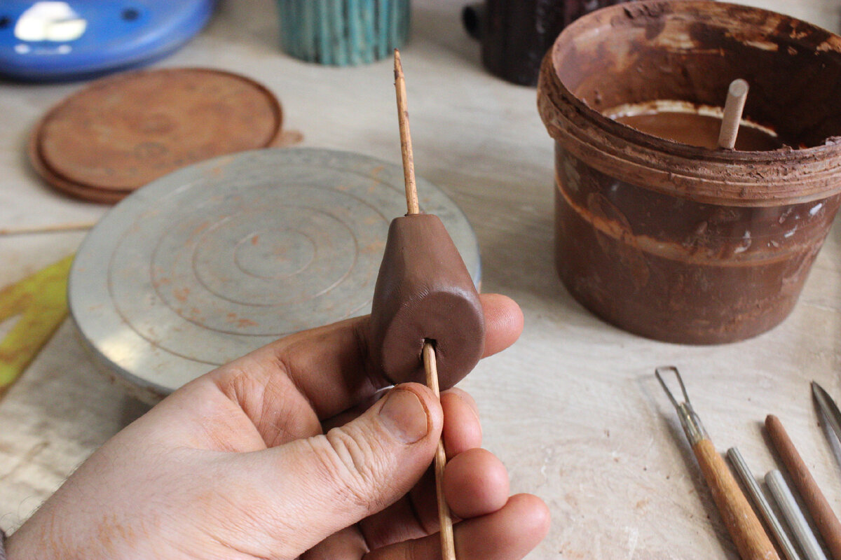 Мы для начала поговорим о лепке носика. Тут момент такой, что носик можно просто слепить из комка, затем располовинить и выбрав петлёй лишнюю глину, склеить его обратно. В результате получится хороший носик сложной формы. Но я не люблю лишних склеек, поэтому формую носики из цельного куска вокруг деревянных стержней разной толщины.