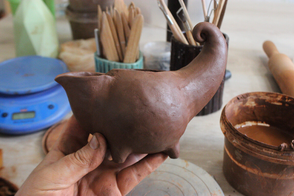 Мой художественный замысел сегодня совсем другой, поэтому лепим, правильную ручку. Лепится она так же как и носик - формовкой и вытягиванием.
