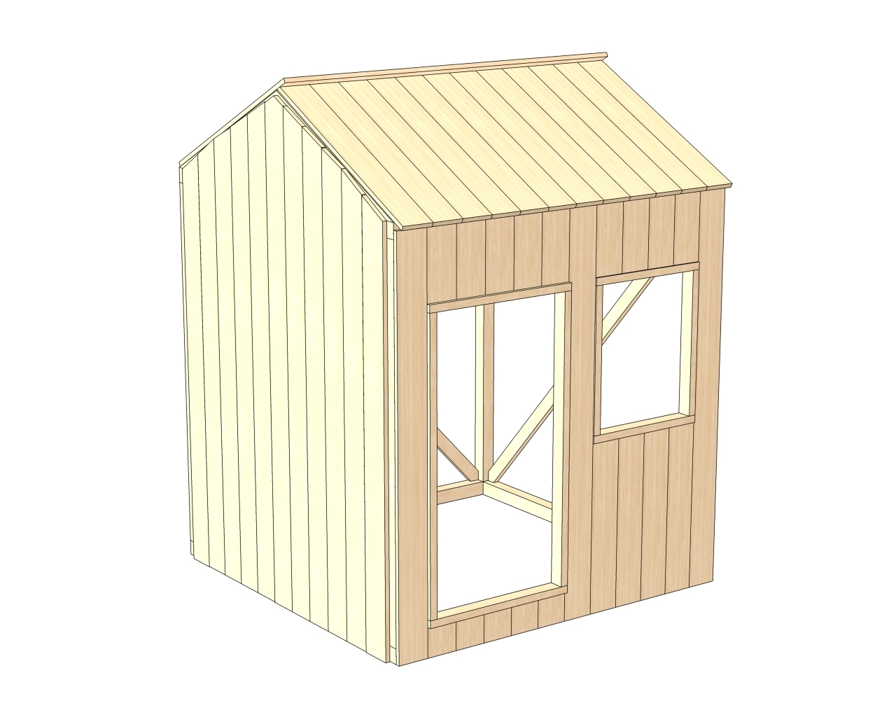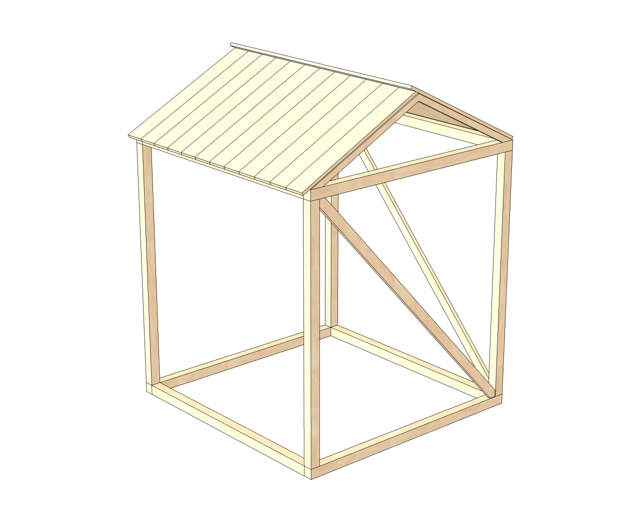 Описанного материала хватило для обшивки крыши, фасадной части, и одной боковой. Дом решили поставить в угол, поэтому на прилегающих к стенам сторонах дома просто сделал укосины из оставшейся вагонки.