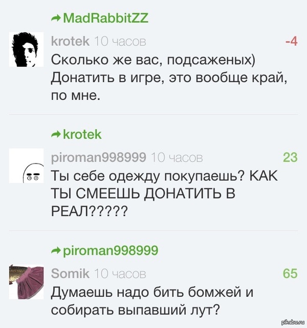 Если в игре покупаешь меч за золото, заработанное за квест, то это норма. А если в реале покупаешь одежду за деньги, заработанные за работу, то это донат? Про бомжей смешно))но во втором сообщении логики нет.