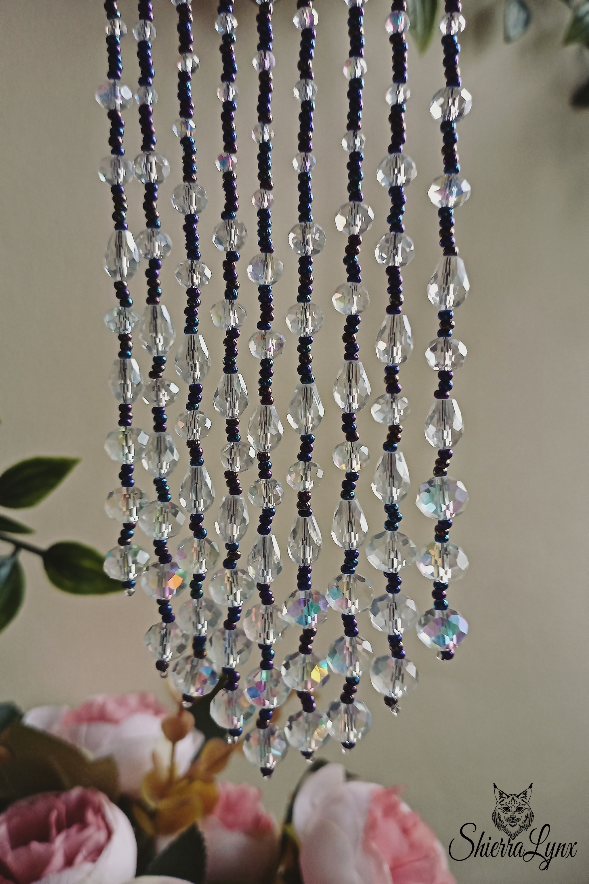 Потому что бусины граненые. Обычный свет они просто пропускают через себя, создавая эффект бликов. А яркий направленный или солнечный отражают радужными зайчиками