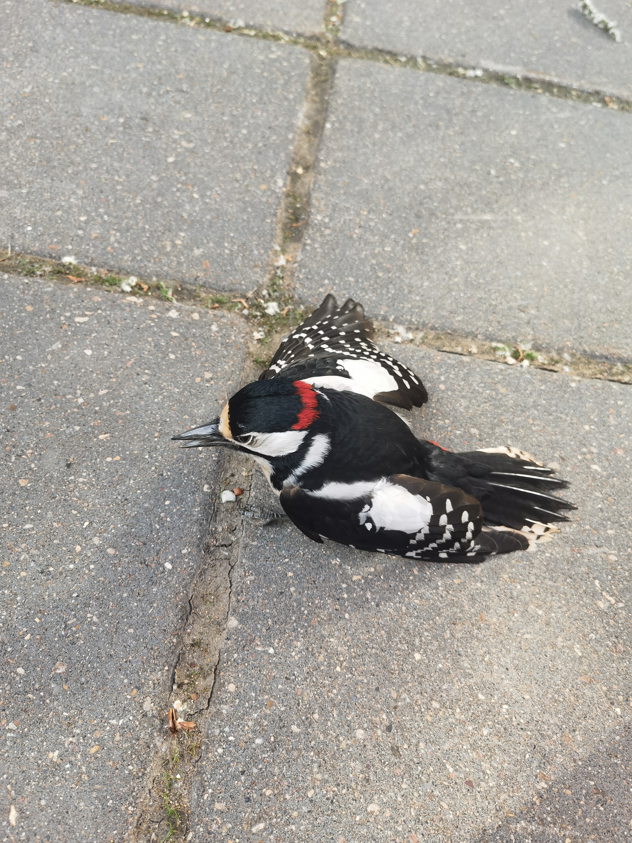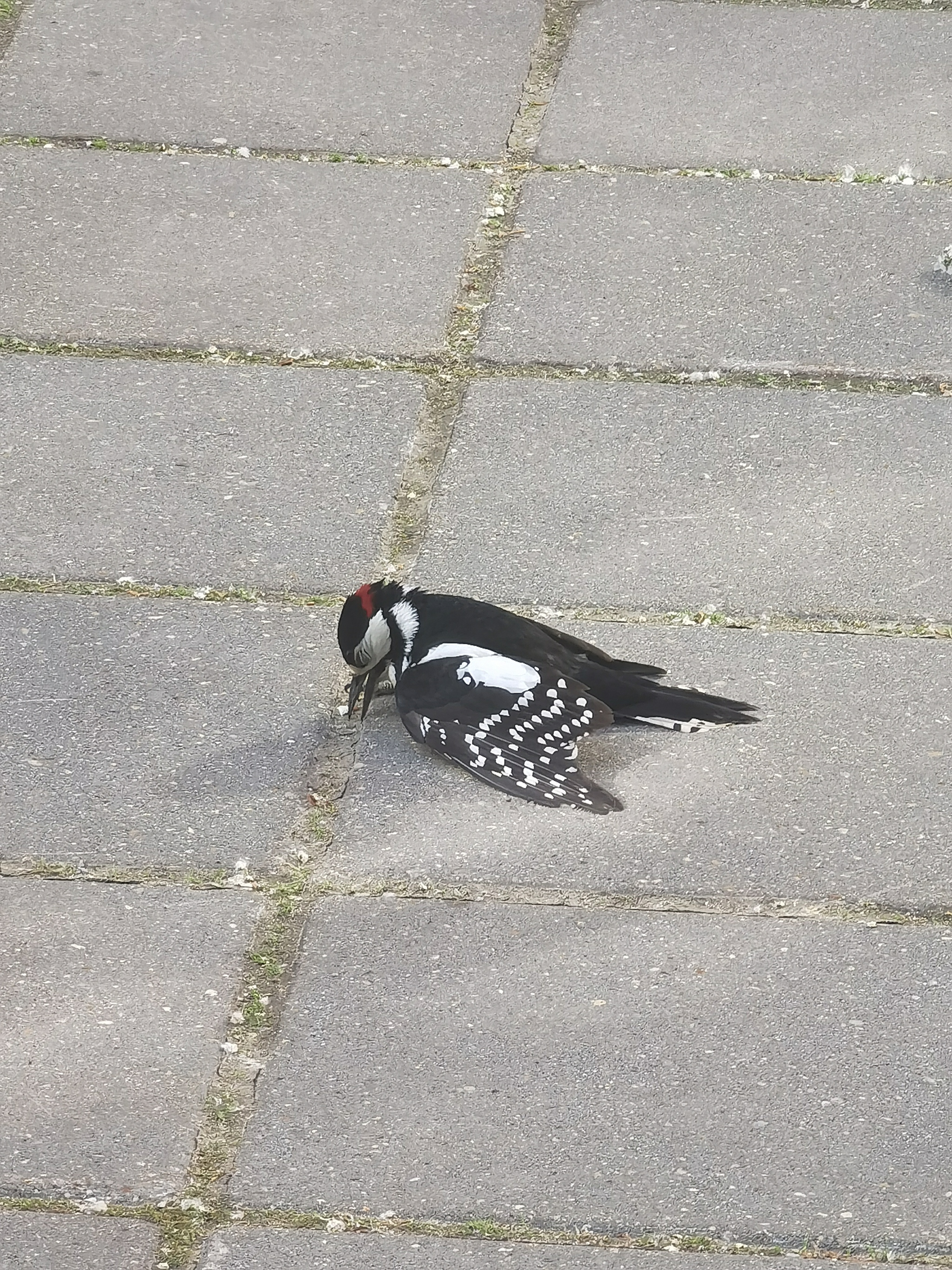 Стало ясно, что дятел скорее всего врезался в дом и оглушен.