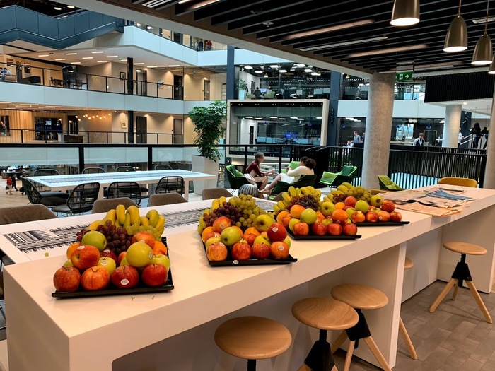 На каждом этаже есть своя станция питания с бесплатными фруктами и напитками.