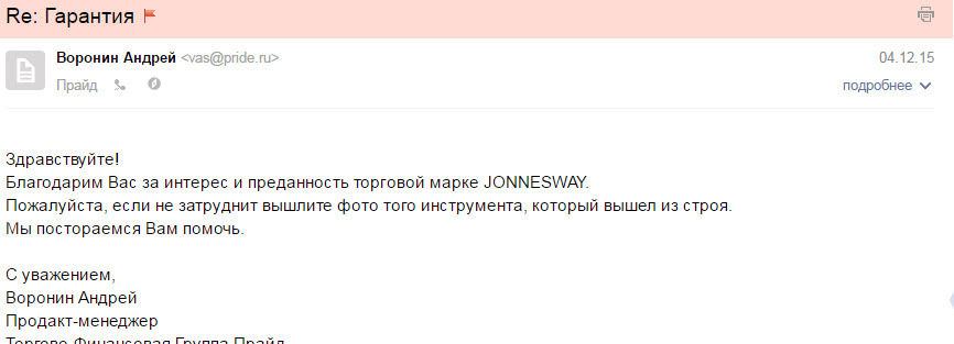 Ответили быстро и попросили сделать фото сломанного инструмента. Затем спросили где нахожусь и подарили новую головку и кардан. Сработали оперативно, за что им большое спасибо.