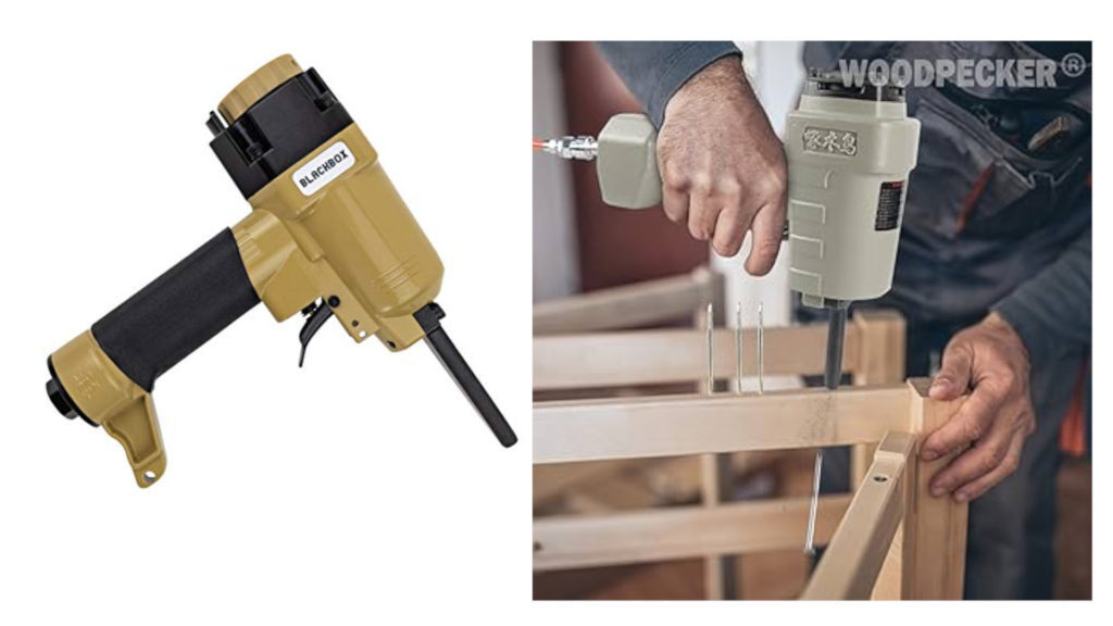 Ну и напоследок пневматический денейлер. Позволяет как дозабивать торчащие шляпки, так и выбивать торчащие гвозди с обратной стороны. Конструктивно это трубочка, внутри которой есть плунжер, приводимый в действие сжатым воздухом.