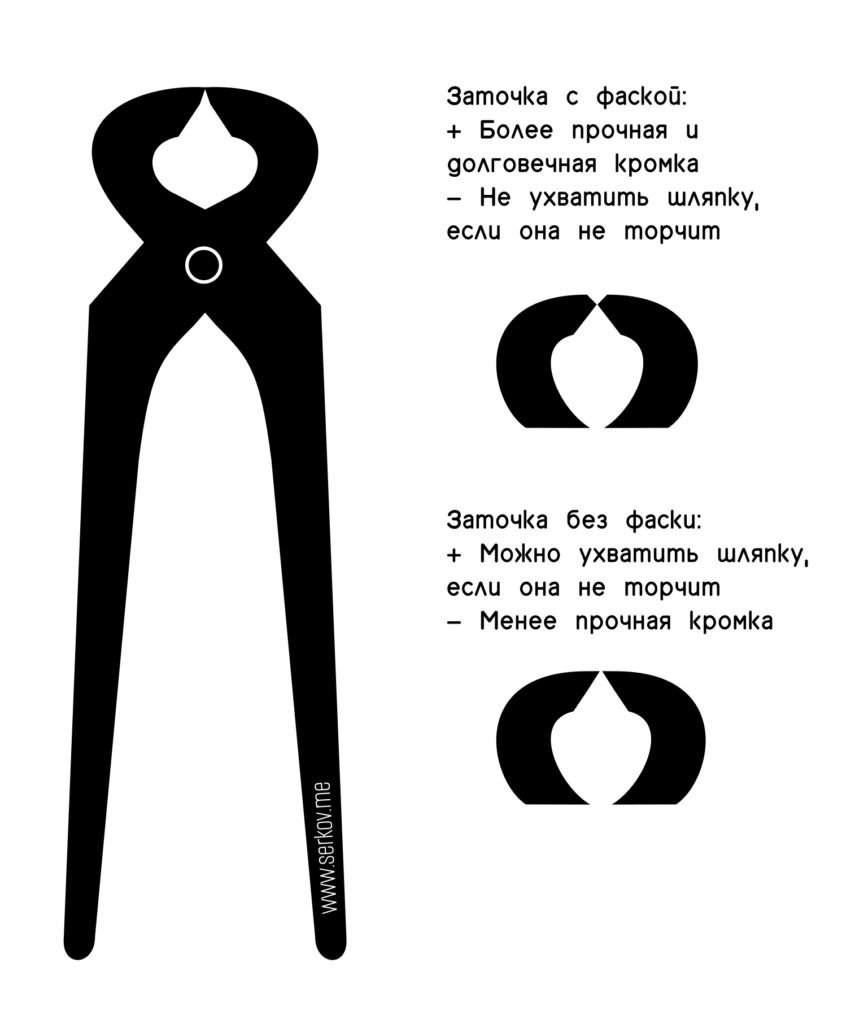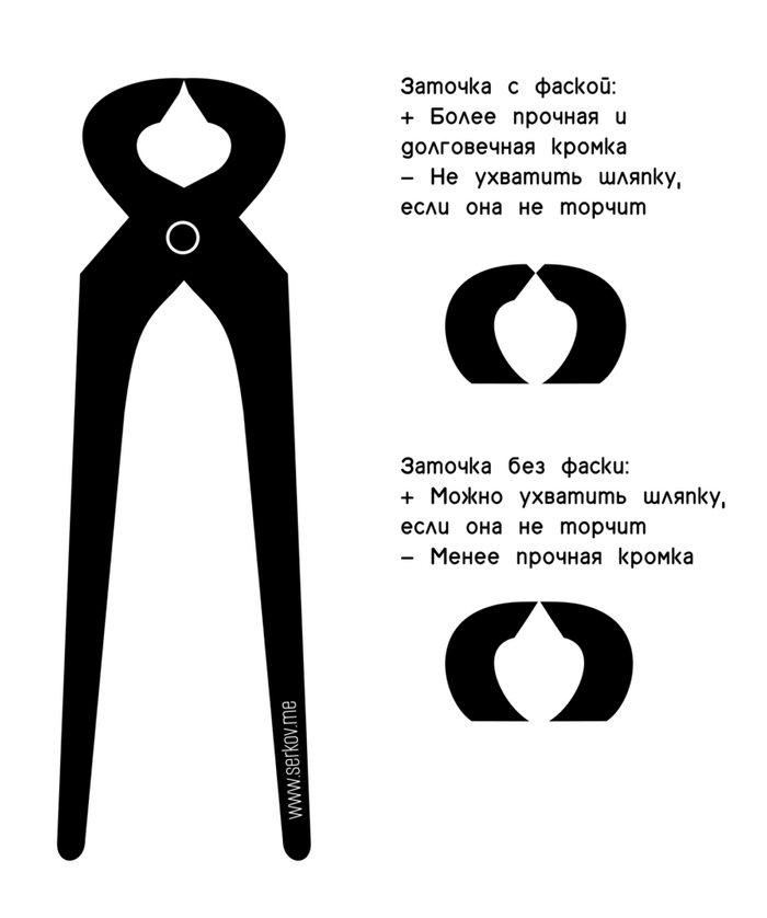 Но что делать, если нужно вытащить гвоздь с оторванной шляпкой, или того хуже — забитый почти заподлицо? Тут на помощь приходят клещи. Ими зажимают гвоздь за тело и также вытягивают, упирая инструмент на пятку. Но тут есть важный момент, о котором почему-то все молчат. Клещи могут иметь разную заточку! Нарисовал пояснительную иллюстрацию: