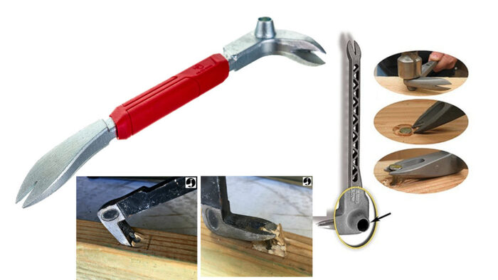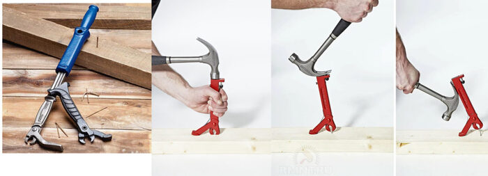Но что делать, если головка гвоздя не просто заподлицо, а она вообще утоплена? Увы, в таком случае придется немного повредить древесину. Для извлечения таких гвоздей используют инструмент «кошачья лапка«. Это гвоздодёр с заострением, который можно забить под шляпку гвоздя. Некоторые варианты имеют цилиндрический пробойник, позволяющий аккуратно смять дерево вокруг шляпки, чтобы подлезть инструментом.