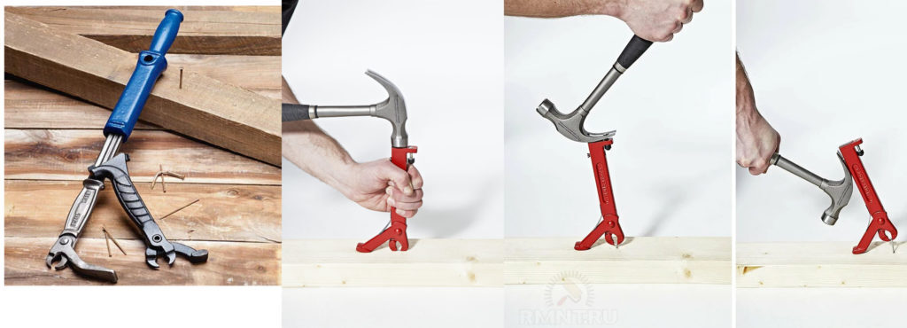 Ну и наконец ударный гвоздодёр, в наших магазинах не видал, только под заказ. Забивается своими клешнями в дерево и захватывает шляпку. После извлечения, в месте гвоздя остаются две аккуратные вмятины. На фото ниже компактная версия, используемая вместе с молотком, и крупная версия, где рукоятка из массивной чугунины, позволяет скользя по направляющей забивать клешни в дерево без дополнительного инструмента.