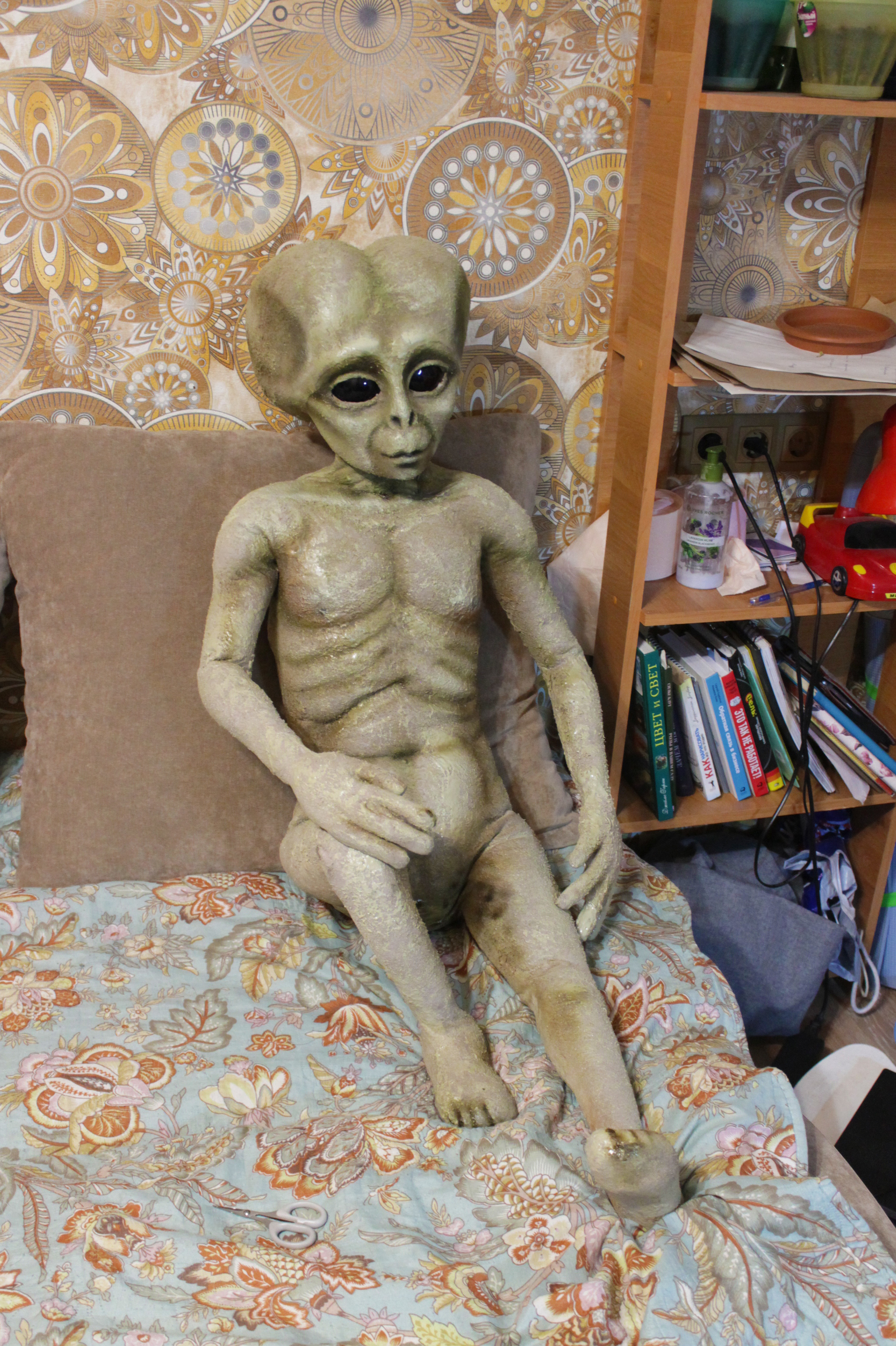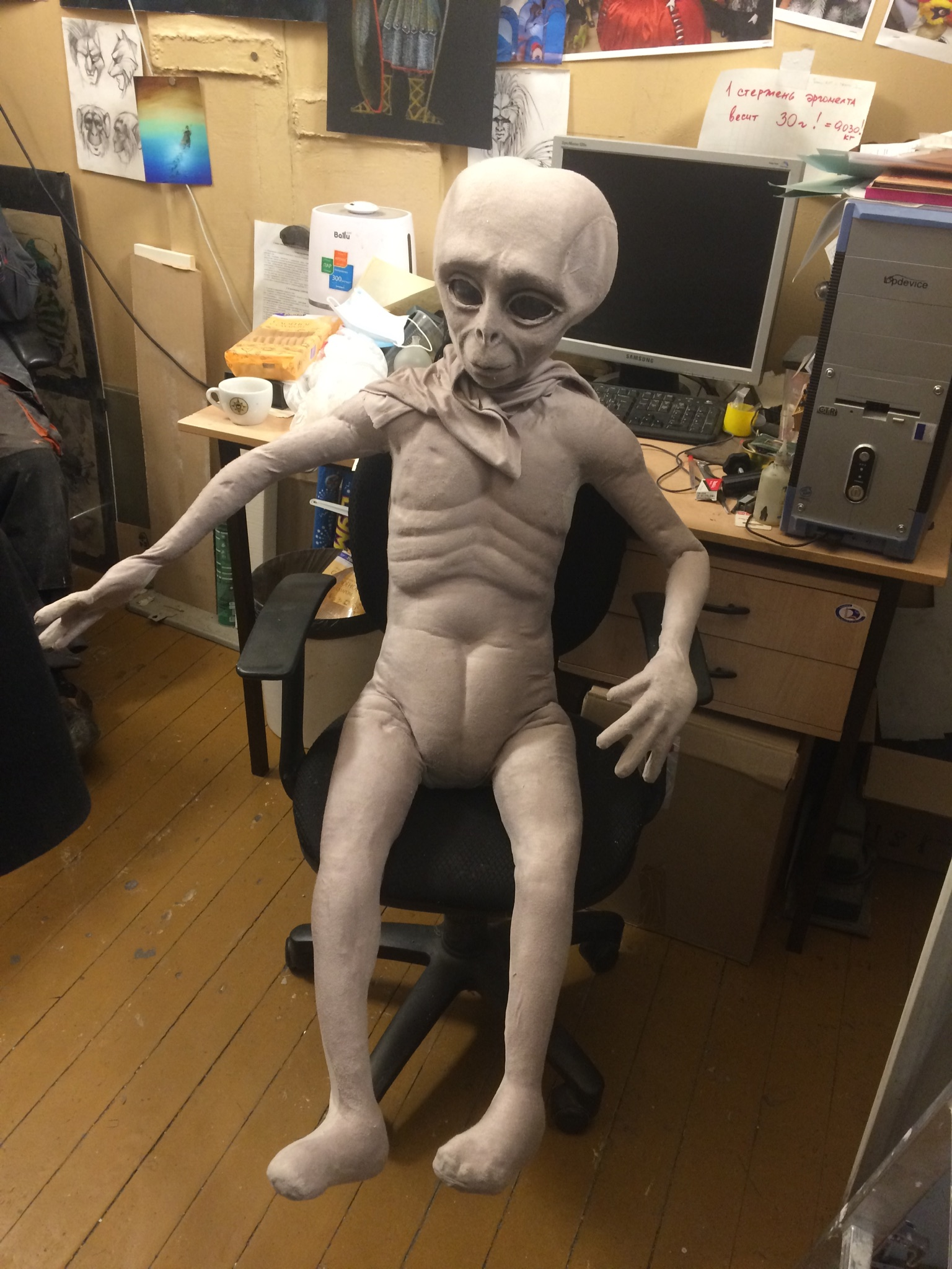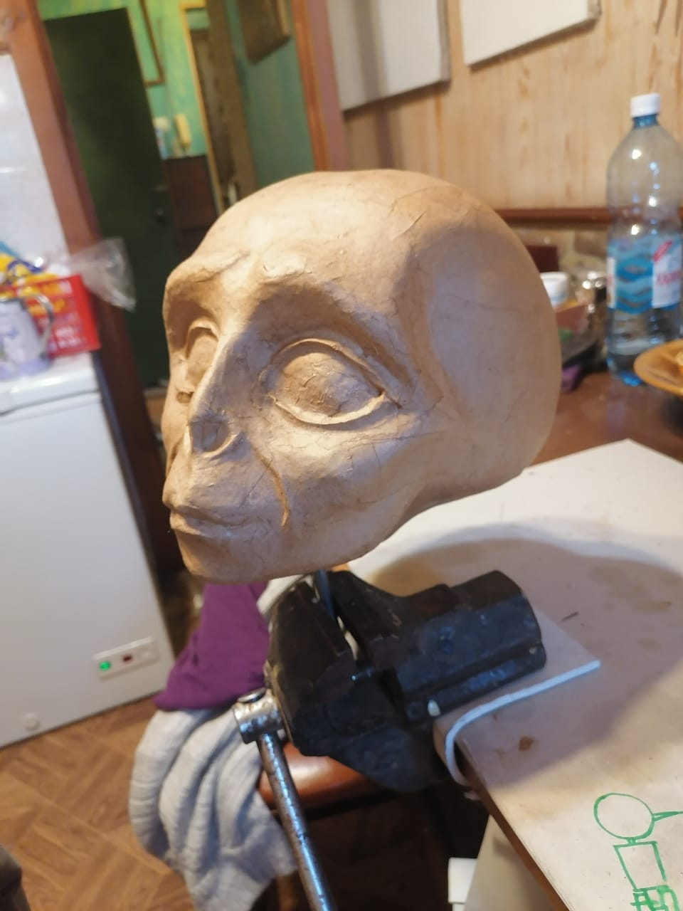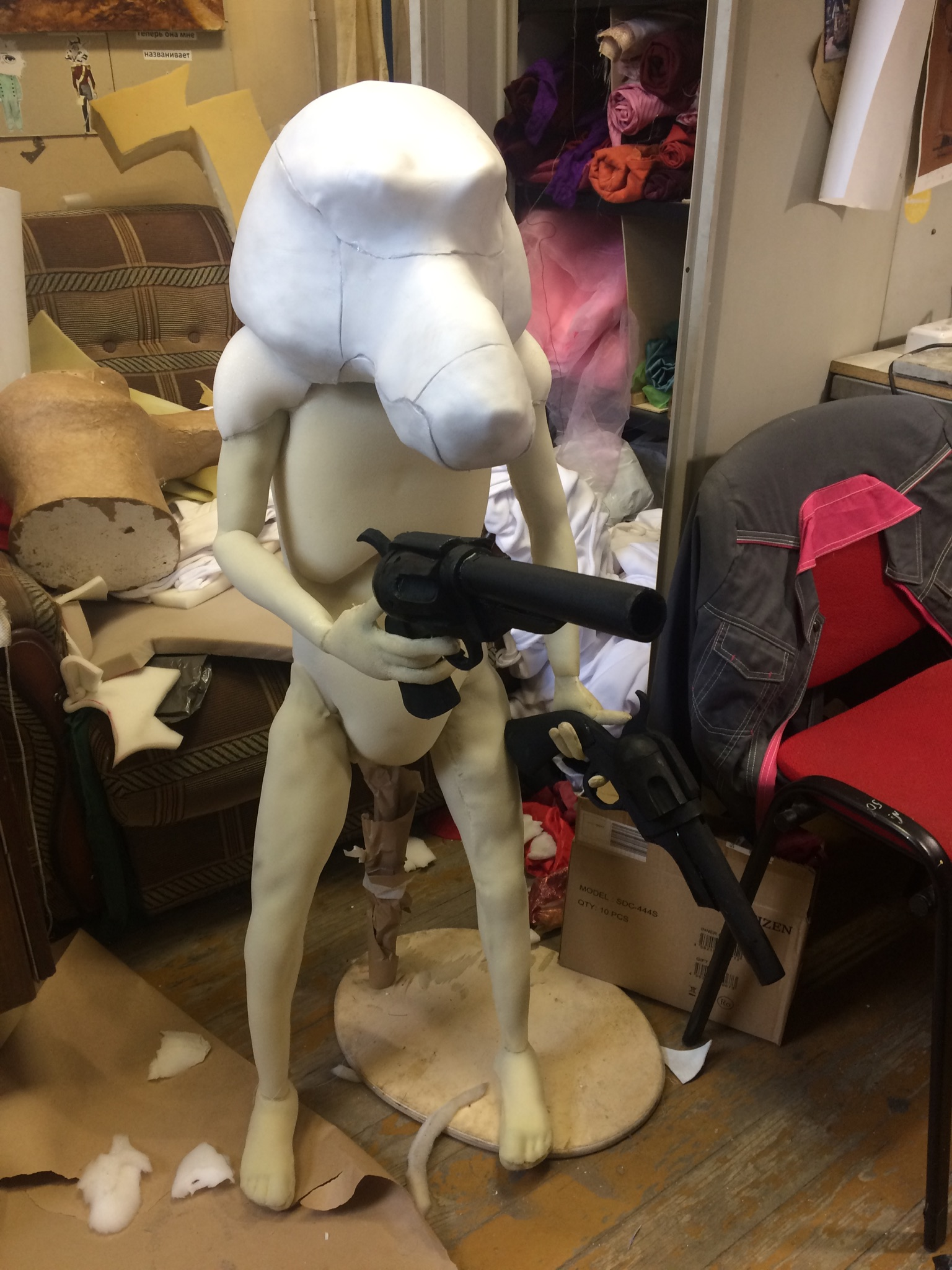 Голову делал мой коллега. Нарисовал эскиз, вырезал из пенопласта, оклеил папье-маше, тканью.
