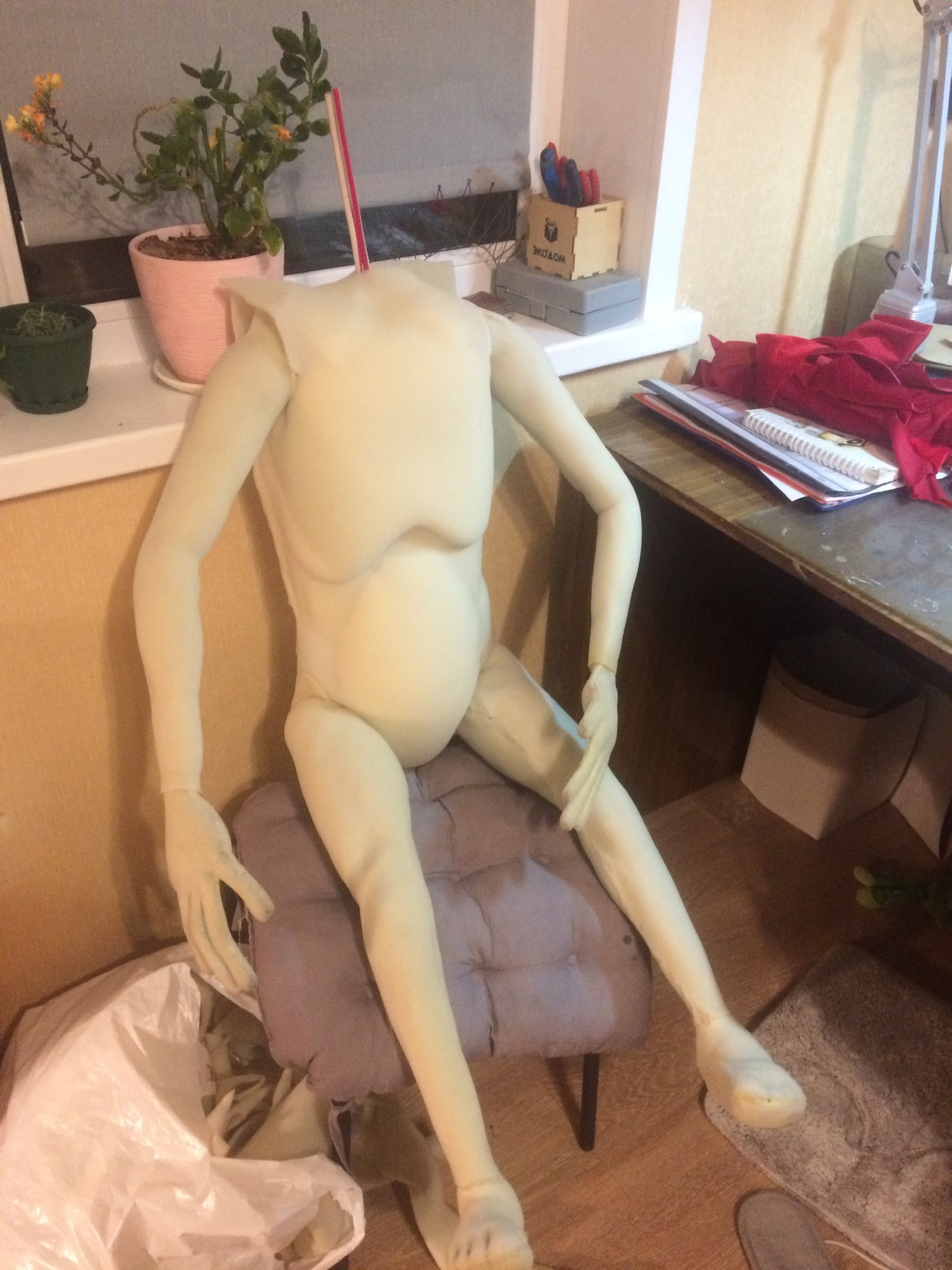 В середине сентября я начала делать Илюшу. Рост его примерно 1 м 20 см. Внутри подвижный каркас. Ну, обо всем по порядку.