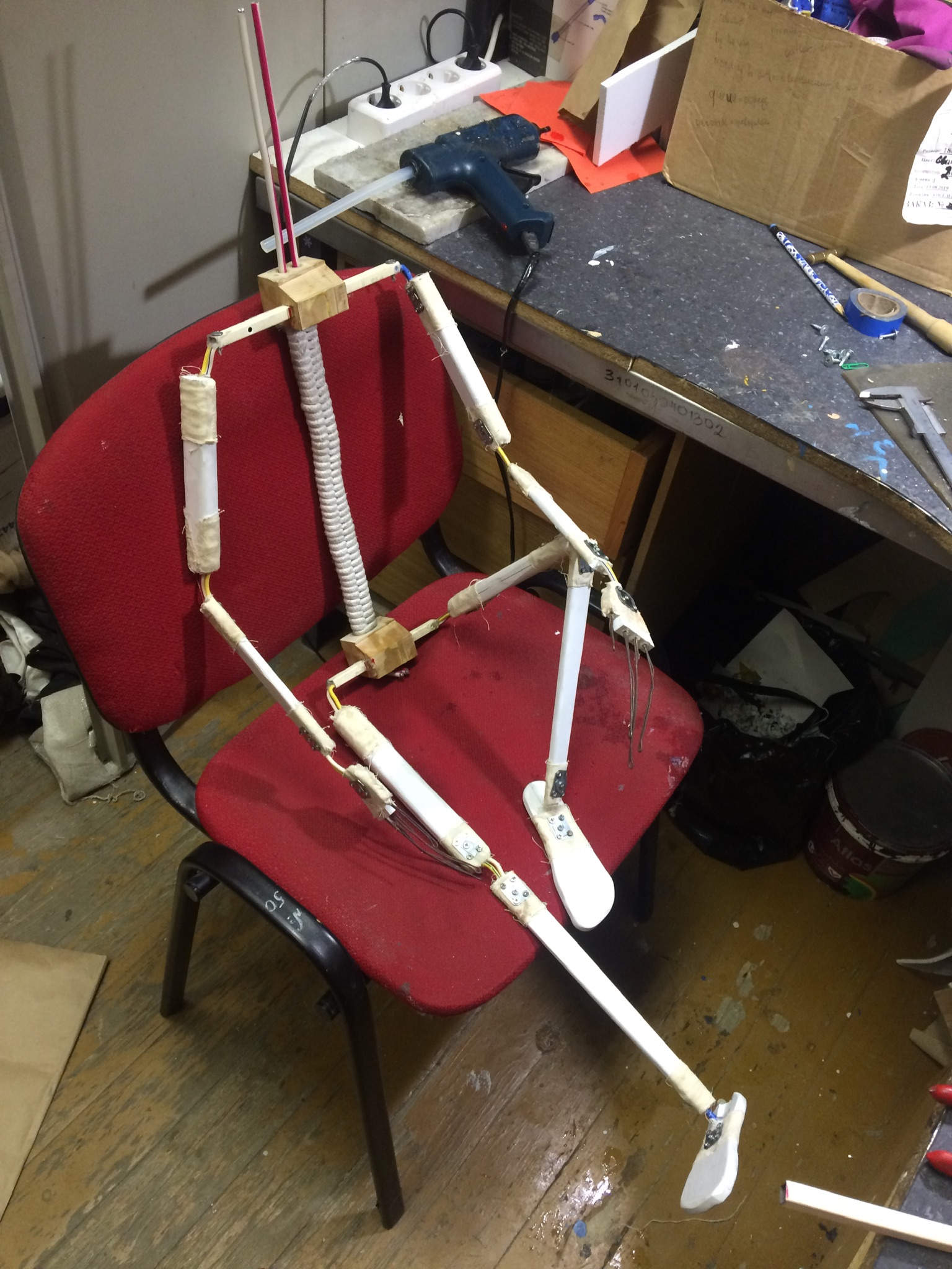 Позвоночник из той же проволоки, что и "суставы". Он обмотан веревкой для стабилизации.