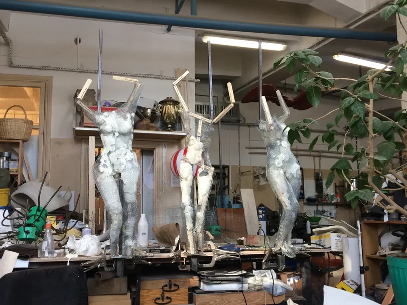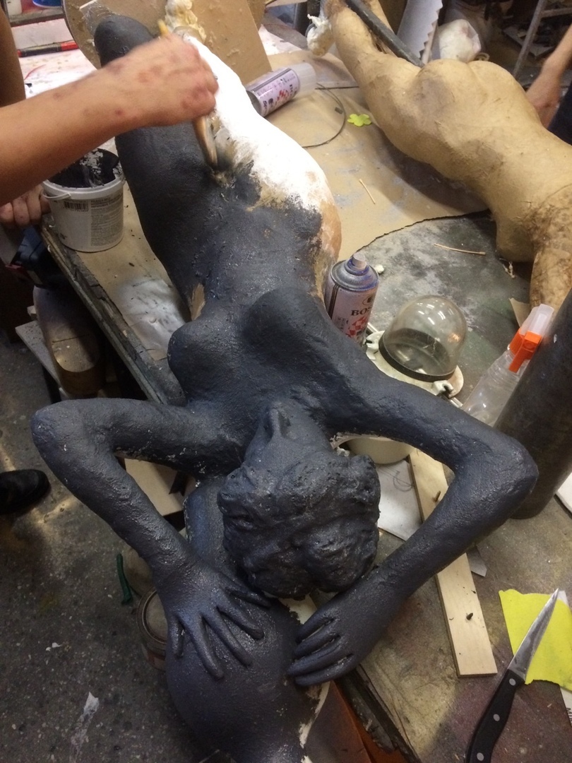 Вернёмся к девчонкам. После заполнения их пеной, монтажа головы и рук, их обклеили бумагой. Затем мы покрыли их шпатлёвкой по дереву, смешанной с акриловой краской, придав цвета и текстуры.