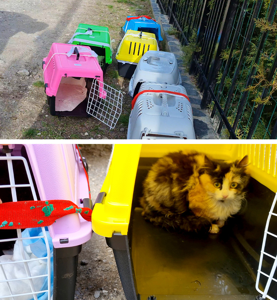 Просто не было. Многие из кошаков остались дикими - лояльных я выловила вручную сразу. Попадаясь в ловушку они бились, выли, царапали себе носы, но другого способа не существовало. После поимки каждая кошка переваливалась в переноску, и клетка заражалась для новой жертвы. Я была уверена, что из-за такого стресса мохнатые меня возненавидят и уже не подойдут никогда.
