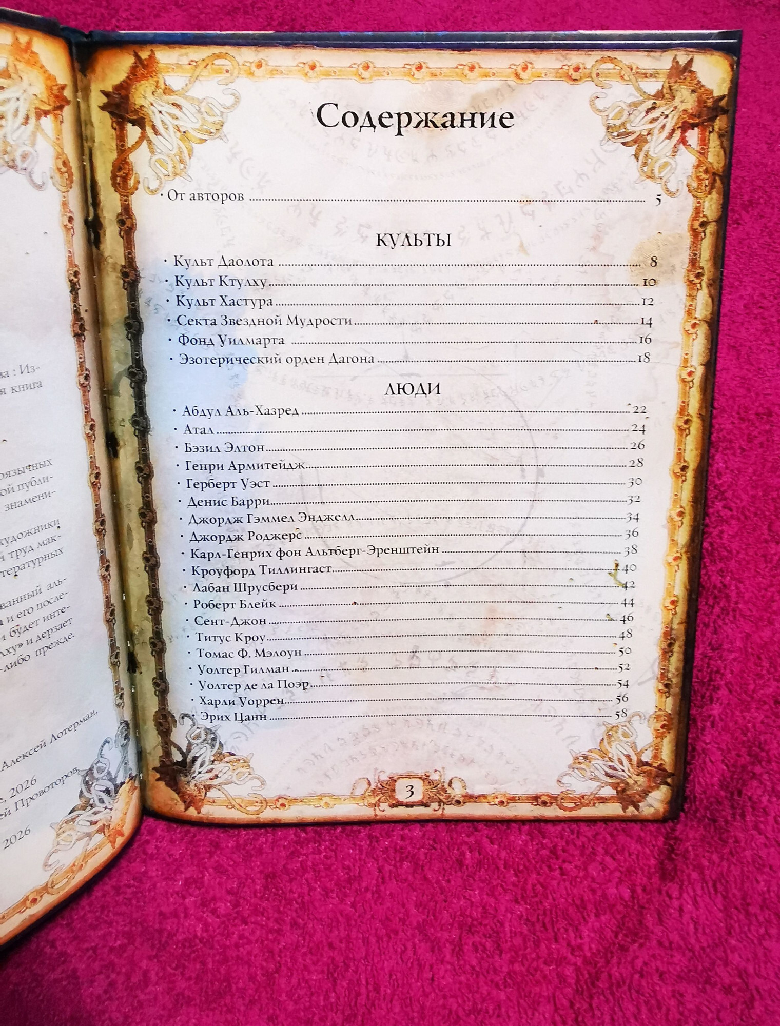 Первый том серии был посвящён монстрам, второй — магическим артефактам, а третий, к сожалению, заключительный (так указано в предисловии) подробно рассказывает о культах и значимых для лавкрафтовской мифологии персонажах.