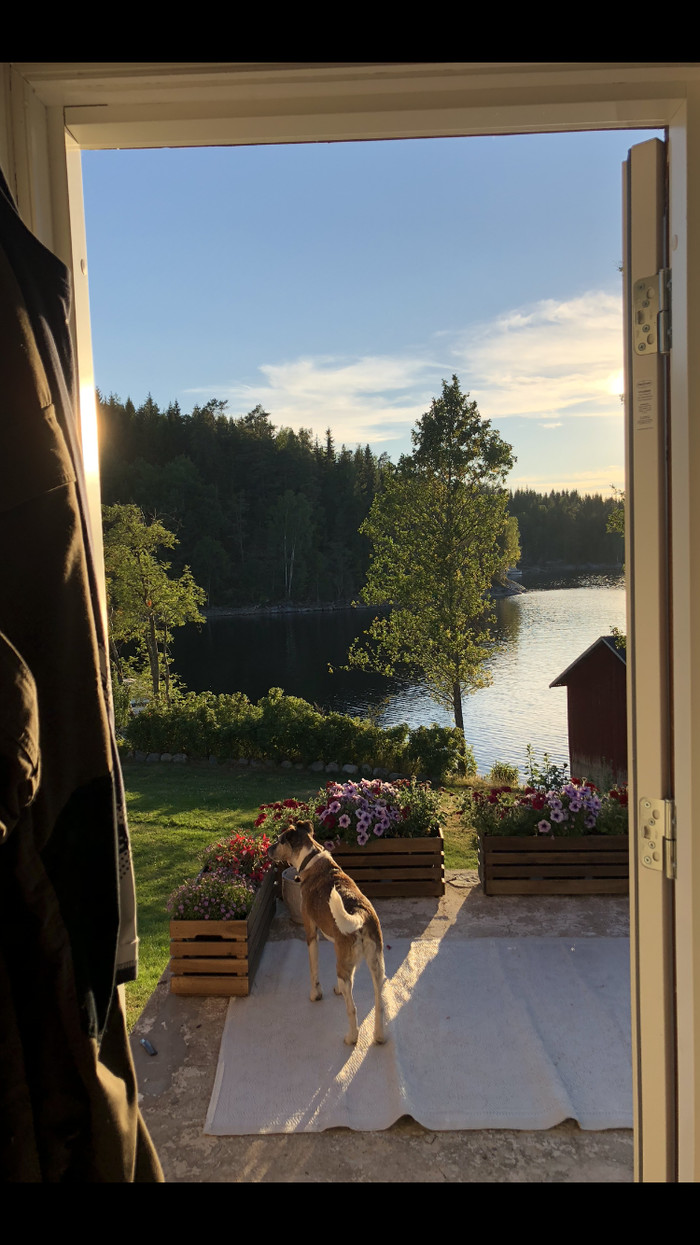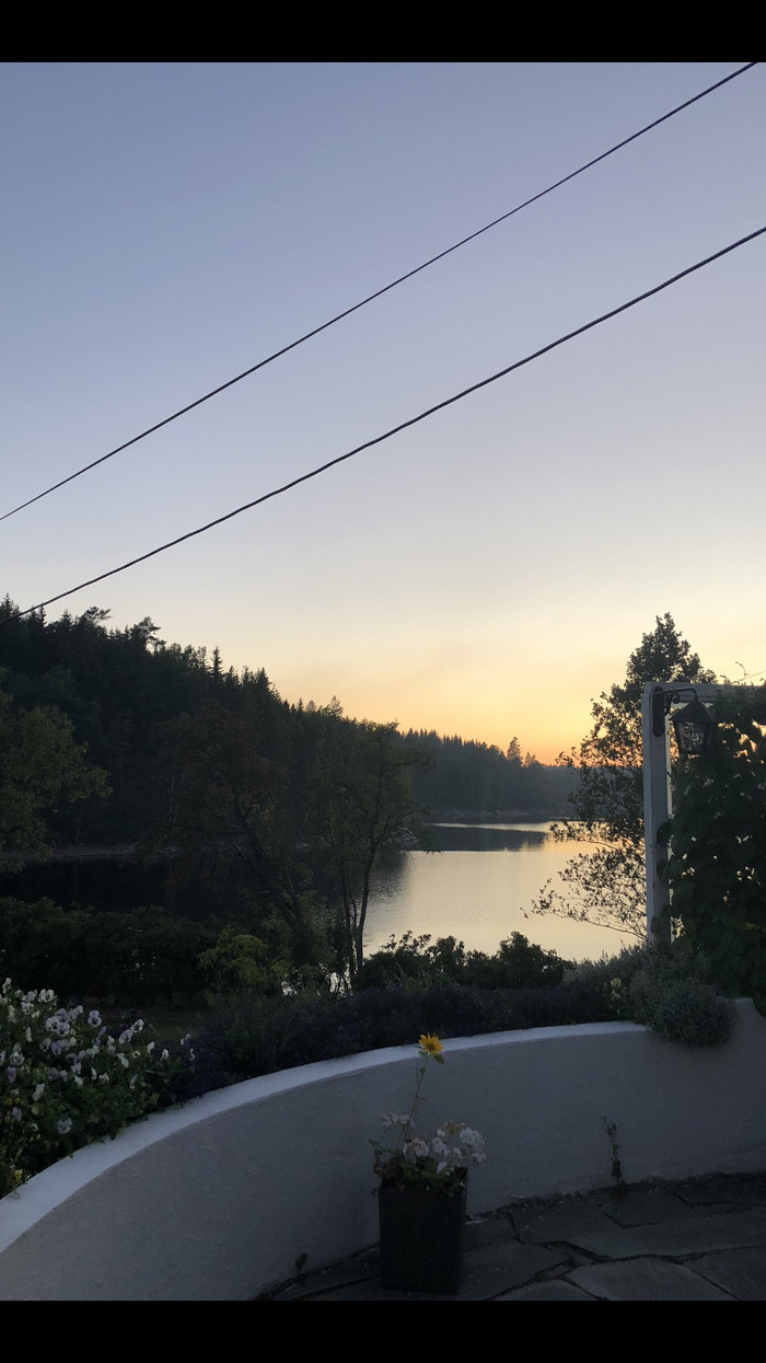 Но просто поверьте, это очень страшно, видеть мнгновенно поднимающийся дым от лесного пожара, когда дождя не было уже 3 месяца, вокруг лес с пересушенными торфяниками и это вообще возможно наша территория... А если и не наша, то один порыв ветра и все. Муж на бегу начал набирать пожарку, там уже на автоответчик было записано, что если по поводу конкретно этого места, то пожарные уже в пути. Он как был в шортах, так и уехал. Приехал через час, переодеться в нормальную одежду, сказал что пожарных не хватает, вертолеты все на крупном пожаре в другом городе, нужна помощь добровольцев. Сам пожар меньше гектара, это он его нашёл и показал дорогу технике( он охотник, и в нашем околотке все тропинки знает) Короче свалил быстро, я сижу нервничаю, все в дыму, уже дышать нечем, ветра почти нет. Фото того вечера, вокруг дома гуляла
