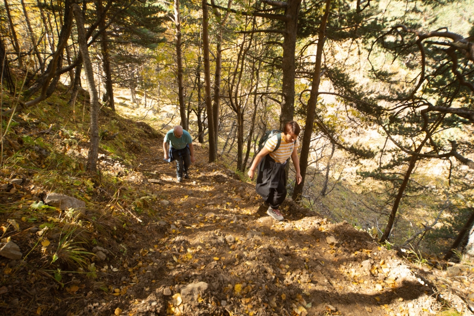 Перед выходом на пеший маршрут есть схема, где указано, как идти к леднику, а как идти к нарзанам. Так вот, на схеме нарисовано, что нужно перейти какой-то мостик через речку, и потом уже начинается тропа на ледник. Мы нашли «какой-то мостик» в лесу, перешли через него, и тропа пошла в гору под углом градусов в 30… Нет, мы умные, мы знаем, что ледник тает, из него вытекает река, и если идти параллельно реке, то рано или поздно придёшь к леднику. Но в тот момент мы подумали, что, наверное мы сейчас как-то быстренько по короткой дороге поднимемся в гору, а там тропинка выведет нас к леднику.