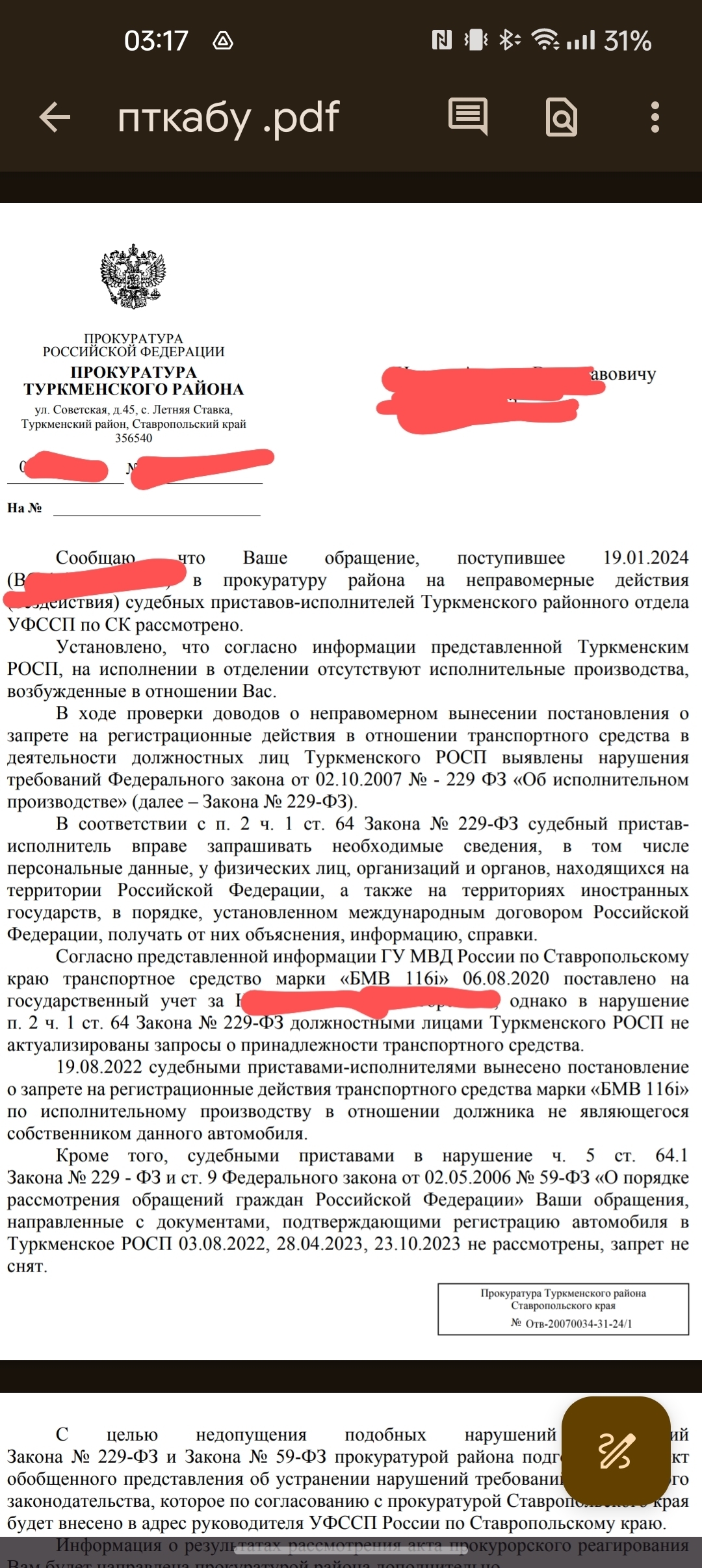 Мне дали номер непосредственно того самого пристава, звонил ему раз 200-300 , ни разу не ответил, потом звонил начальнику отдела около 100 раз, ни разу не ответили, потом мне сказали в канцелярии что Нестветаев вроде как не работает больше, и дали нового пристава, но итог тот же. Само собой моё терпение лопнуло и я обратился в прокуратуру РФ . Там моё обращение ещё 2 месяца ходило по ведомствам, и приходит письмо мол запрос отправлен в главное Управление ФССП Липецка, на самого главного начальника, и вот тут я думаю сейчас то точно снимут все ограничения, но хер...! Прошёл еще месяц...