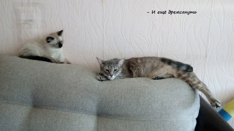 В общем, ушла Маруська в спальню на подоконник, отвернулась к окну и начала изо всех сил обижаться. Правда, от еды и вкусняшек не отказывалась))) Ланс проявлял разумность и не лез лишний раз; если оказывался рядом, Маня шипела и котёнок быстренько ретировался. Дня через 3-4 до Маняши дошло, что сидеть на окне - не лучший выбор, подоконник узкий, пузику жестко, так что к концу недели можно было застать ее спящей на кровати, но заметив людей, обижулька вновь запрыгивала на подоконник и продолжала дуться. Хватило ее на две недели, потом сидеть одной надоело и Маха вернулась к привычной жизни и дивану, но наглого подселенца отгоняла грозным шипением, а Лансу так хотелось пообщаться с новой подружкой! Вот типичная ситуация того периода: