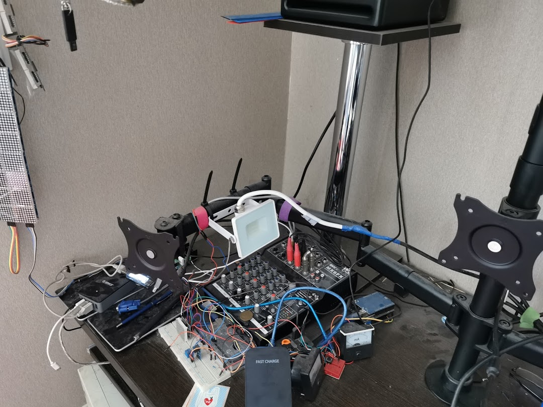 И обратите внимание на подсветку. Это на лапы кронштейна прикручены пара светодиодных прожекторов и включены всегда когда включены и мониторы. Это позволяет не замечать смены времени суток и глаза не болят из-за смены яркости.