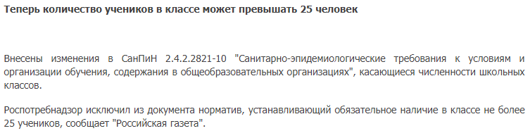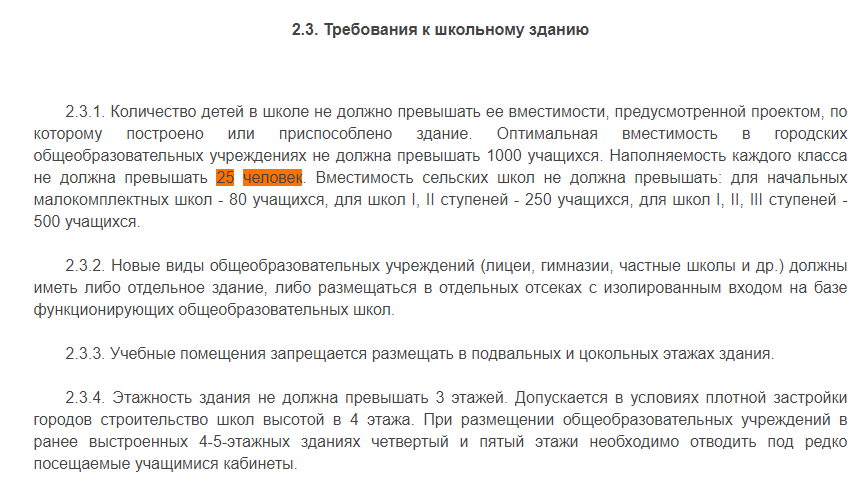 Т.е. раньше по нормам, количество человек в классе не должно превышать 25 (!!!). Это взято не с потолка. Были проведены исследования.