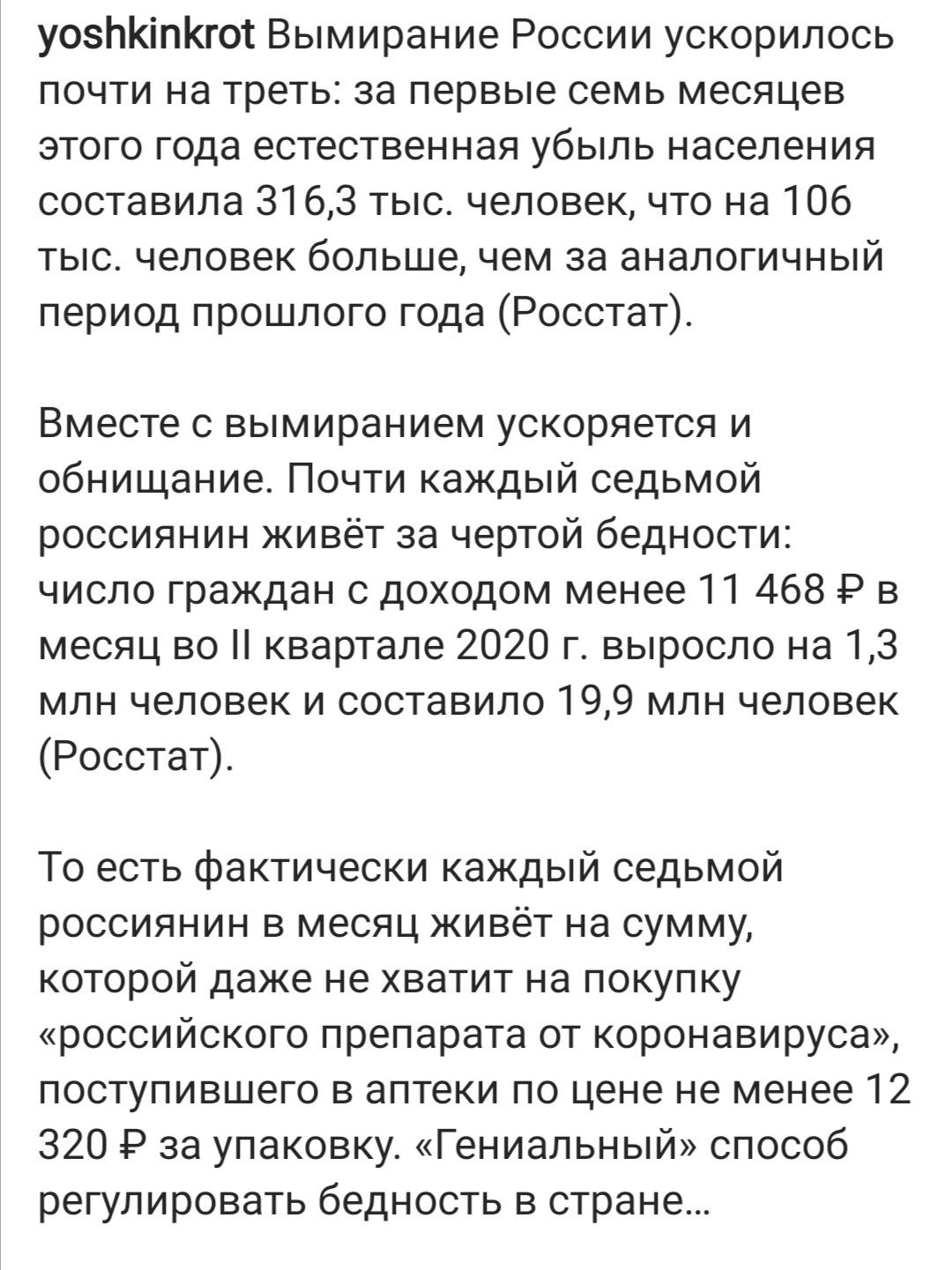 Прожиточный минимум в РФ - 12 тысяч. Жкх - 2 тысячи. Осталось 10. Мне 34 года, но я в месяц на лекарства (диротон, арифон ретард, л тироксин и рыбий жир для снижения холестерина) 1000, осталось 9. Мне нужно где то работать, что бы кто то платил мне этот минимум. Соответственно на оставшиеся 9 тысяч я должен тратить на проезд, обед на работе, ужин дома и завтрак. А ещё необходима одежда. Да это в принципе не реально прожить на эти деньги. Ну пол года, а потом что - цинга блядь, как в средневековье?