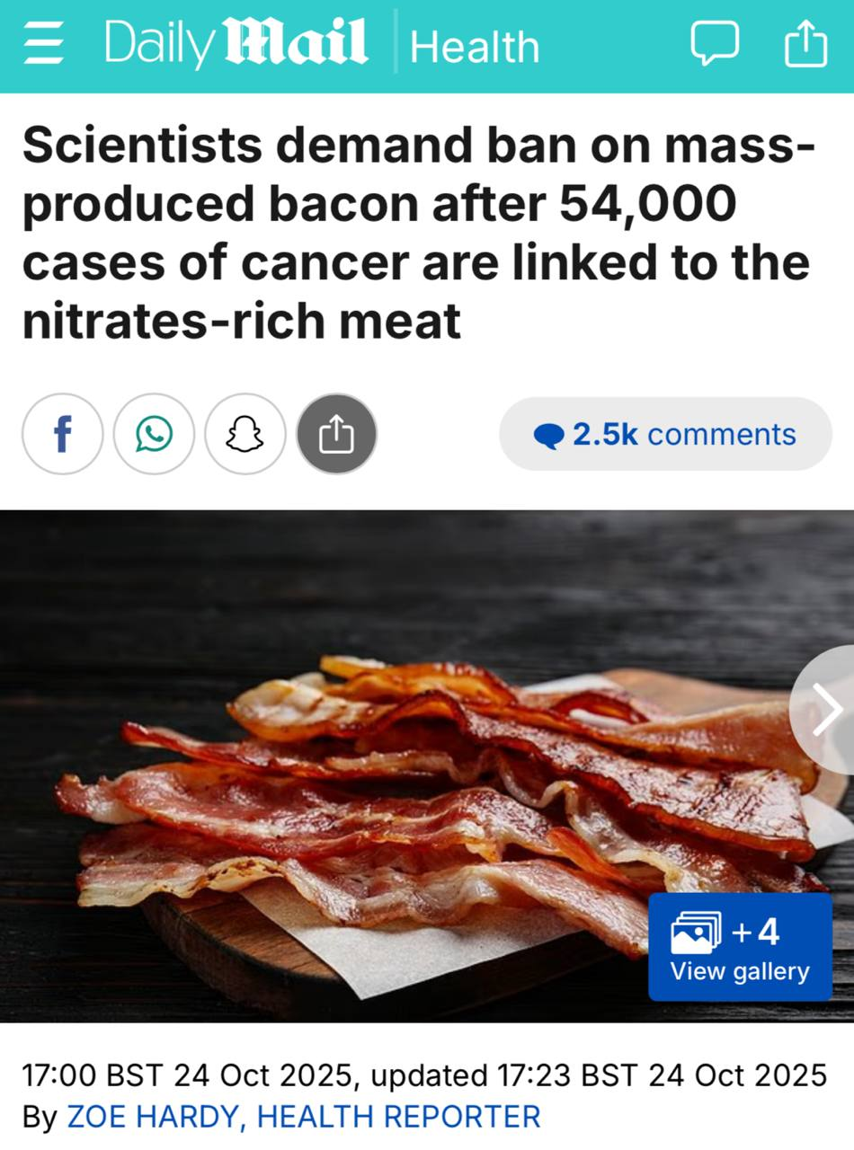 Учёные связывают нитритный бекон с 54 тыс. случаев рака кишечника. Нитриты в беконе, колбасе и ветчине при переваривании превращаются в канцерогены. Консерванты, продлевающие срок хранения мясных продуктов, тоже способны вызвать рак.