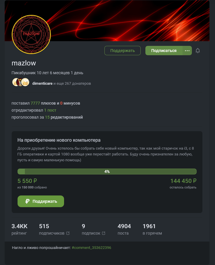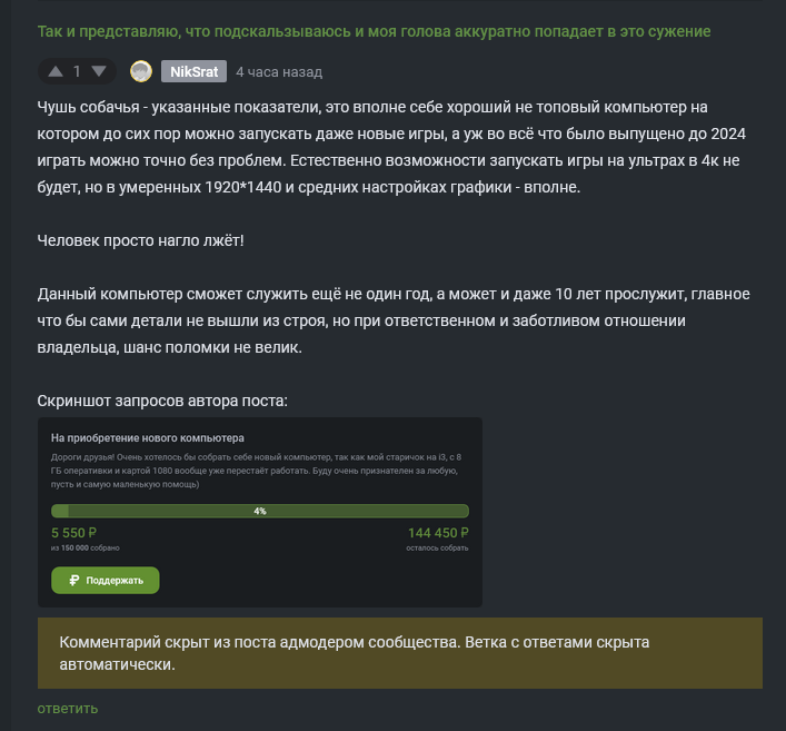 Листая ленту увидел пост, внизу заметил наглый развод доверчивых граждан. Написал мнение в комментах, а по итогу получил очередной беспредел от зазвездившегося "самодержца" который почувствовал себя барином благодаря идиотским нововведениям на нашей пикабушке.