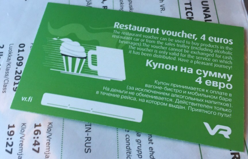 Ехала она 1-го сентября из Финляндии в Москву, с пересадкой в Питере, на скоростных поездах, Аллегро + Сапсан. Все должно было пройти чинно благородно: Аллегро прибывает по расписанию в 19:27, Сапсан отправляется в 21:00, времени в запасе куча. Но что-то у финнов пошло не так, и Аллегро задержали аж на 1 час 17 минут. После отправления всячески извинялись, всем пассажирам раздали готовые конверты для отправки претензий, вручили в качестве моментальной небольшой компенсации вот такие ваучеры.