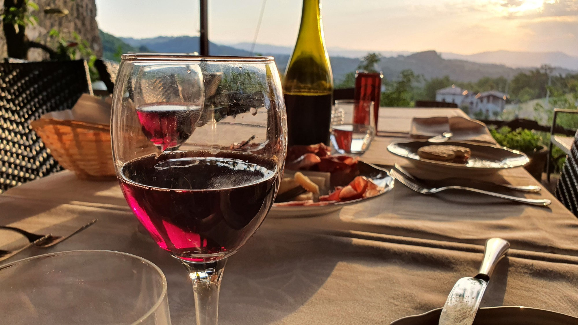 А вот ниже фотография из серии «жизнь удалась» :). Это мы только приехали в то место, где мы в прошлом году жили первую неделю отпуска. Мы были уставшие с дороги и голодные и хозяева усадьбы сделали для нас традиционный итальянский ужин (далеко не бесплатно). На первом плане местное молодое вино Ламбруско. Вино — прекрасное (пить охлажденнным!)! Далее антипасти (сыры, мясная нарезка, хлеб). Этим мы размялись, а основным блюдом были совершенно божественные равиоли. На заднем плане холмы провинции Emilia-Romagna в закатном солнце.
