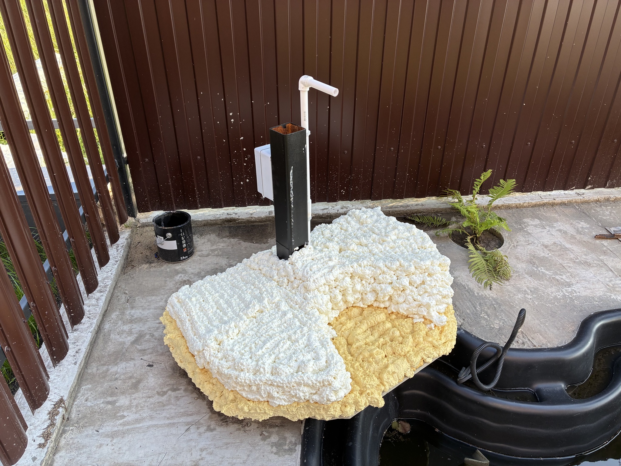 Попутно под него закопал электрику. К насосу и свету. Дальше нужен водопад. Задача. Лепить из камушков не хотелось, нужно монументально! Но для монументальных камушков нужен подьемный кран и денег дохрельон. Арт бетон. Народ в тырнете че только не лепит с него. Красивое. И фигня, что никогда раньше не делал. Прикинул размер, из остатков профтрубы сварил основание. Забетонировал.
