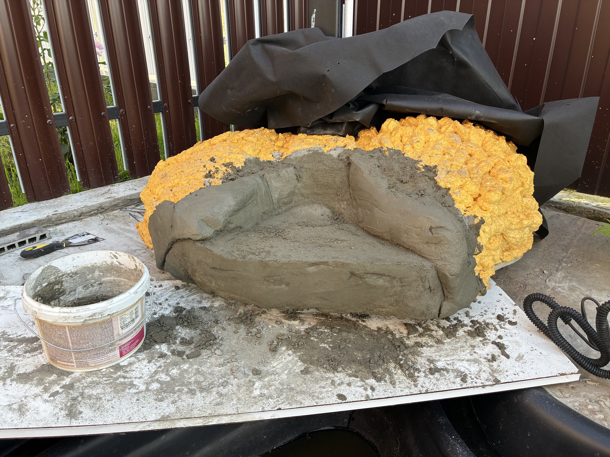 С бетоном так. В интернете «цемент : песок : добавки» 1:3:0,1:0,1. Не понравилось. Делал 1:2 цемент : песок. Гидрофобная добавка и пластификатор. И фибры чуть. Еще пена, дальше ваяем.