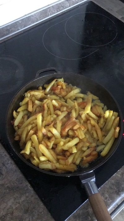 Вот какое вы думаете самое любимое русское блюдо у моего мужа? Жареная, блин, картошка o_0 Он не понимает почему в Норвегии не пользуются этим магическим рецептом. А если ее пожарить на сале (я часто мухлюю и использую бекон), да с луком, и свежей зеленью посыпать, то мой типичный мясоед, может с салатом навернуть целую сковороду)) Я часто устраиваю ужины для местных знакомых «в русском стиле» - и великолепные котлеты по-киевски, оливье с вареным языком и прочие борщи такого интереса не вызывают. Каждый порядочный норвежец скрупулёзно записывает рецепт обычной русской жареной картошки)) Все, кстати, изумляются что картофель НЕ НАДО предварительно отваривать, прямо сырым жарить.