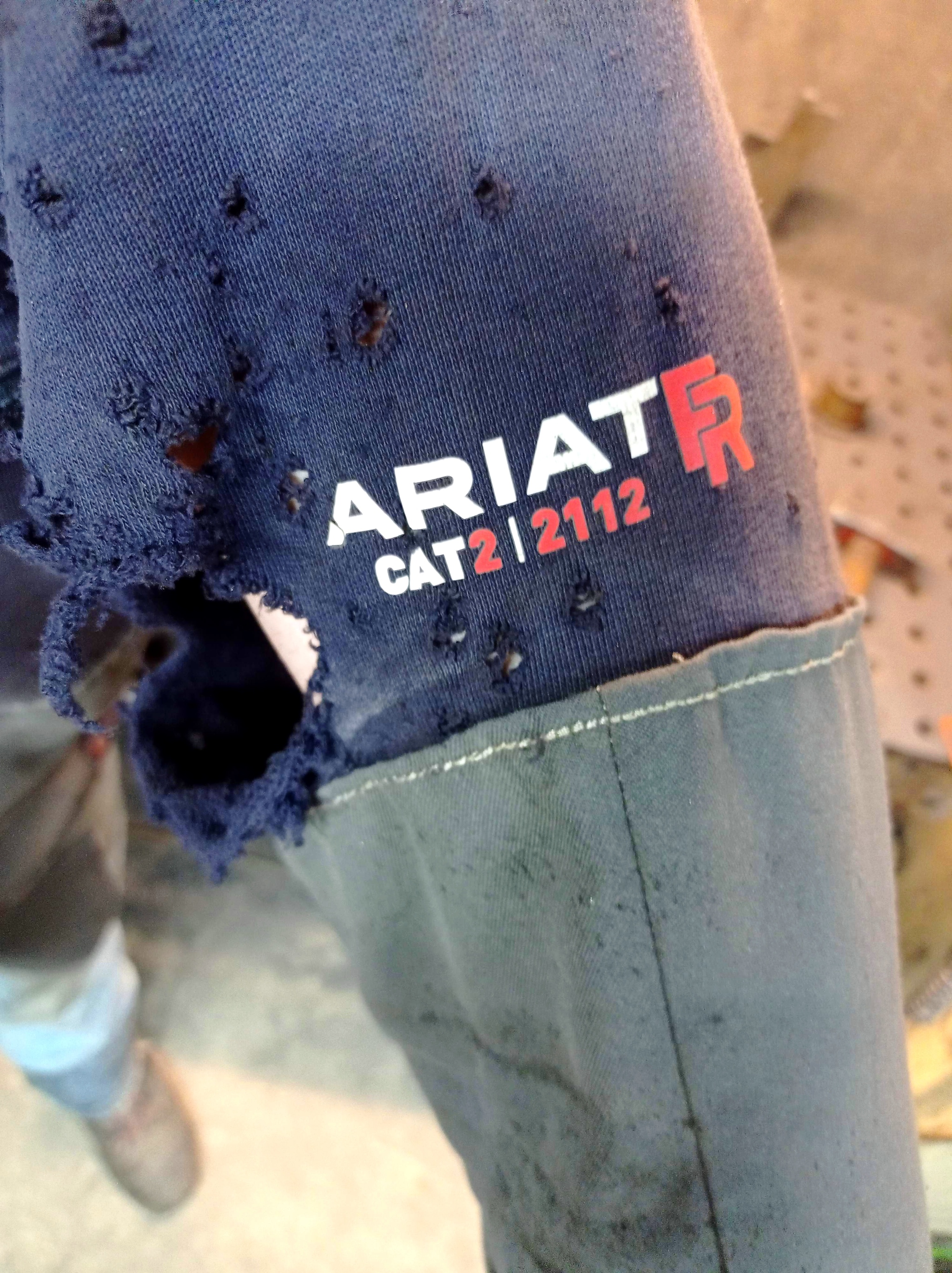 Братья во искре. Вот жена подарила какую-то импортную модную толстовку, которую пожарные тамошние носят, чтоб не стать барбекю. За полгода жизнь этот предмет одежды хорошенько потрепала. Супруга пропатчила её арамидными лоскутами и нитками. Прошёл ещё год и всё это заметно подустало. На фото, собственно, пруф.
