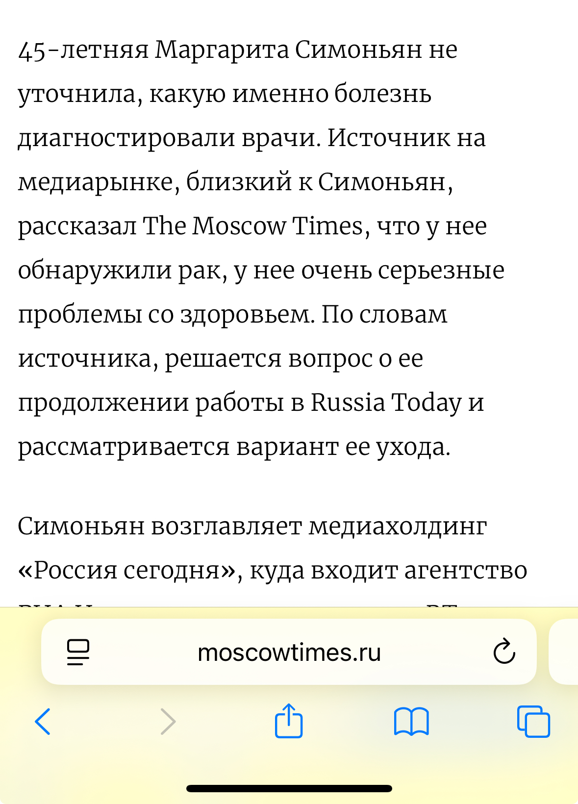 Как мы все сегодня знаем из новостей, у главы Russia Today Маргаритки Симоньян серьезные проблемы со здоровьем. Она сама не уточняет какие, но в Moscow Times сплетничают про рак и возможный уход с должности (см картинку с пруфом).