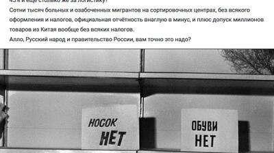 Сотни тысяч больных и озабоченных мигрантов на сортировочных центрах, без всякого оформления и налогов, официальная отчётность внаглую в минус, и плюс допуск миллионов товаров из Китая вообще без всяких налогов.