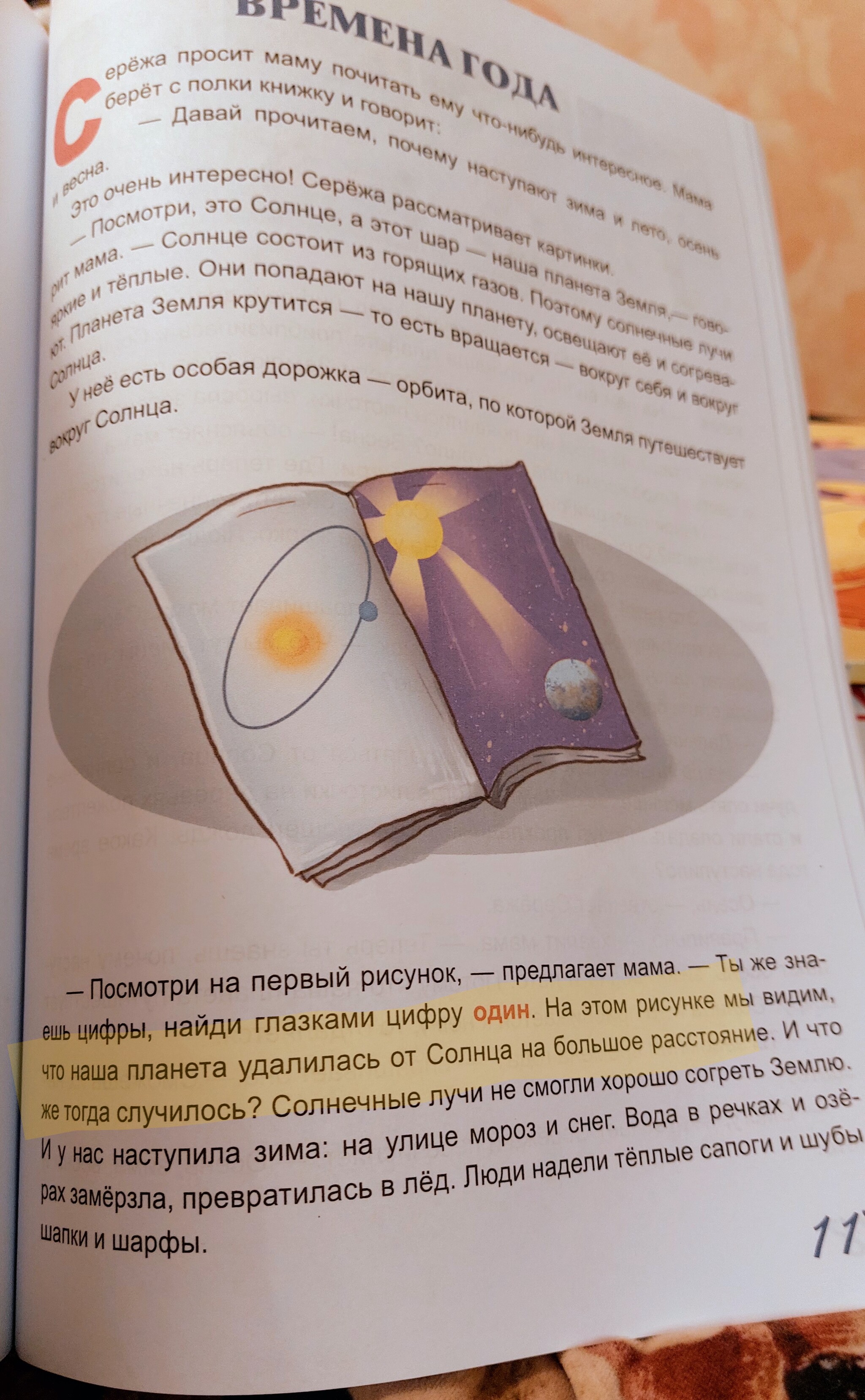 Наша планета удалилась от Солнца на большое расстояние и что тогда случилось?.. Наступила зима. Едрить-колотить. Сначала, не поверила своим глазам, ну, думаю, наверное, дальше будет про наклон оси планеты. Переворачиваю страницу: