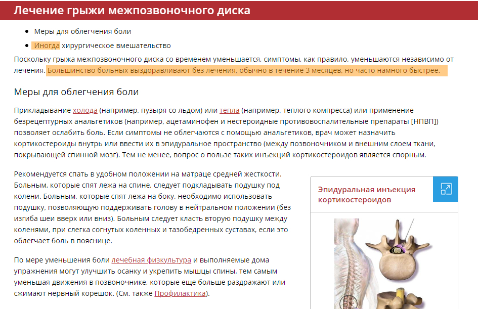 Здесь же, на Пикабу 30-летние жалуются на поясницу, а им выдают советы как сделать МРТ и пойти на операцию, как правильно беречь спину и не напрягаться. Сижу думаю: написать в ответ чё делать в этом случае или нет? И понимаю, что бесполезно. Никто не доверится рандомному мужику из интернета, когда вокруг столько авторитетов вместе с официальной медициной рассказывают как нужно вырезать из позвоночника грыжу, как это хорошо, легко и правильно.