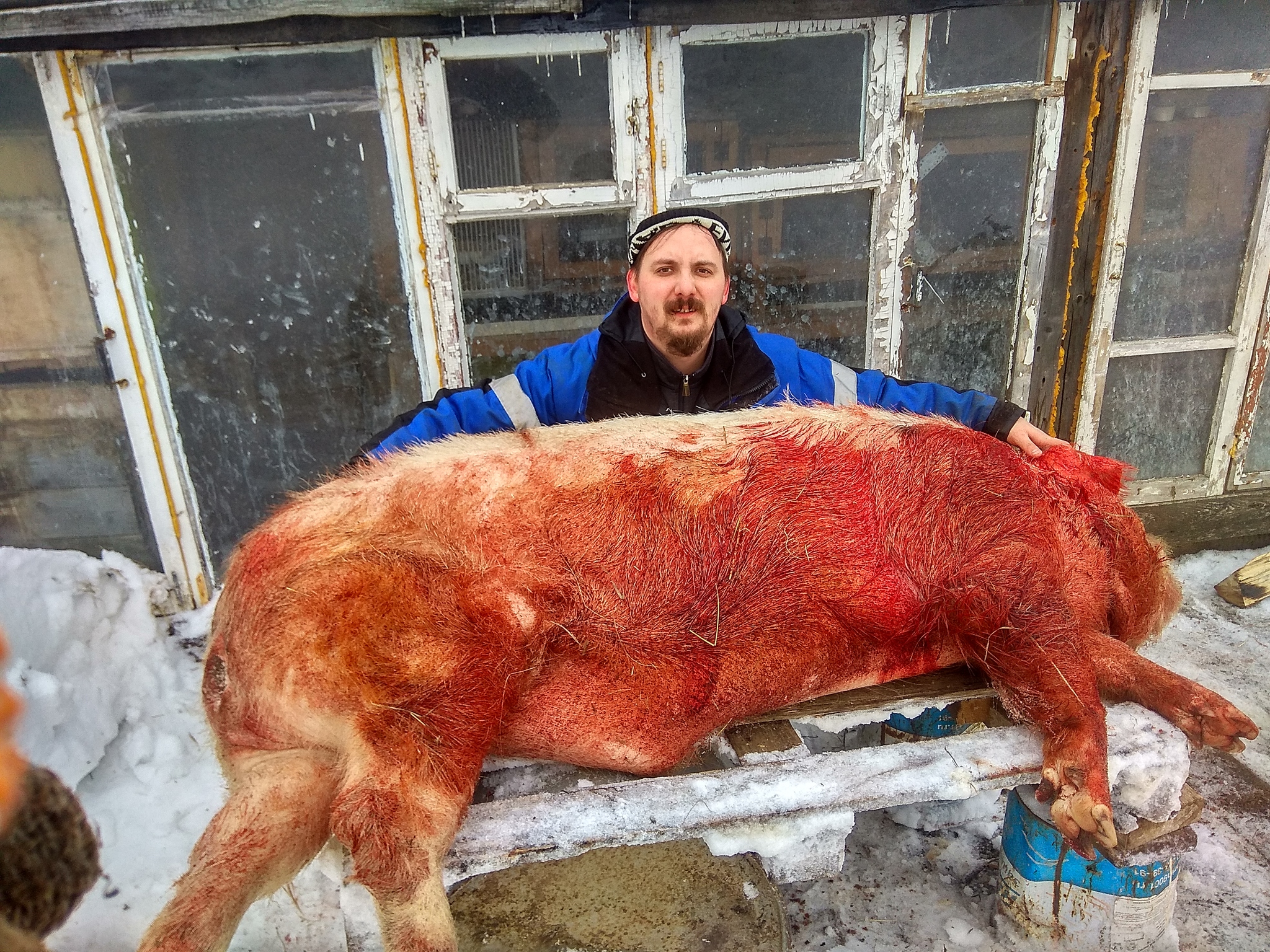 Побежал до соседа, мол Иваныч выручай, форсмажор, караул, все дела. Дай говорю лампу свина обжечь, а он мне отвечает, что уже второй год справляется при помощи газа, и вручает мне пятидесятилитровый баллон с горелкой. Я таких приколов до этого не видел, а потому отнёсся к этой идее с недоверием. Но деваться некуда, свин то уже готовченко. Взвалил эту бандуру на хребет и помчал до себя. Благо Сутулая не позволила соседским барбосам осквернить Бориса, отгоняла их от него аки лев.