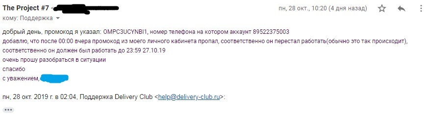 27 числа я возвращался домой(живу с соседом на телефон которого был сделан заказ), и мы решили сделать заказ, пока промокод не "сгорел", скринов не делали(не додумались), время 23:30, делаем заказ, промокод не работает, звоним оператору, они говорят что промокод дается на 2 недели, НО учитывается время доставки смс, то есть если мы получили смс в 19:00, значит и промокод действует до 19:00 того дня который указан в смс(если что в ЛК деливери это не указано, и в смс тоже). мы делаем круглые глаза, и пишем в ТП деливери о случившемся, с просьбой прояснить ситуацию, и с просьбой выдать другой промокод(тк мы считаем, что о времени нужно указывать хоть где-то, чтобы клиент знал об этом).