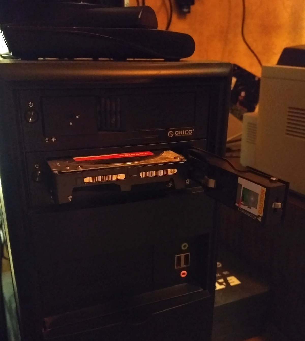 Вы спросите - что это за оранжевая змея в системнике? Это саморегулирующий нагревательный кабель. Если не ошибаюсь, максимальный нагрев до 80 градусов по Цельсию. Включается при опуске температуры наружного воздуха до минус 30 и ниже. Сам по себе тепло отдаёт неочень, но хорошо нагревает корпус в который вплетён. Этим винты и подогреваются, когда совсем холодно.