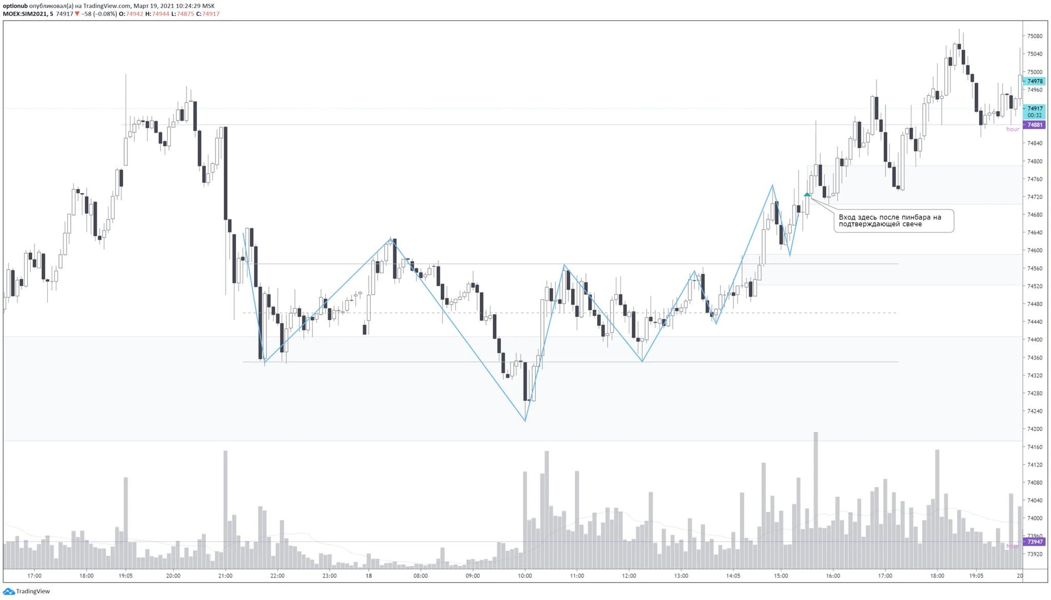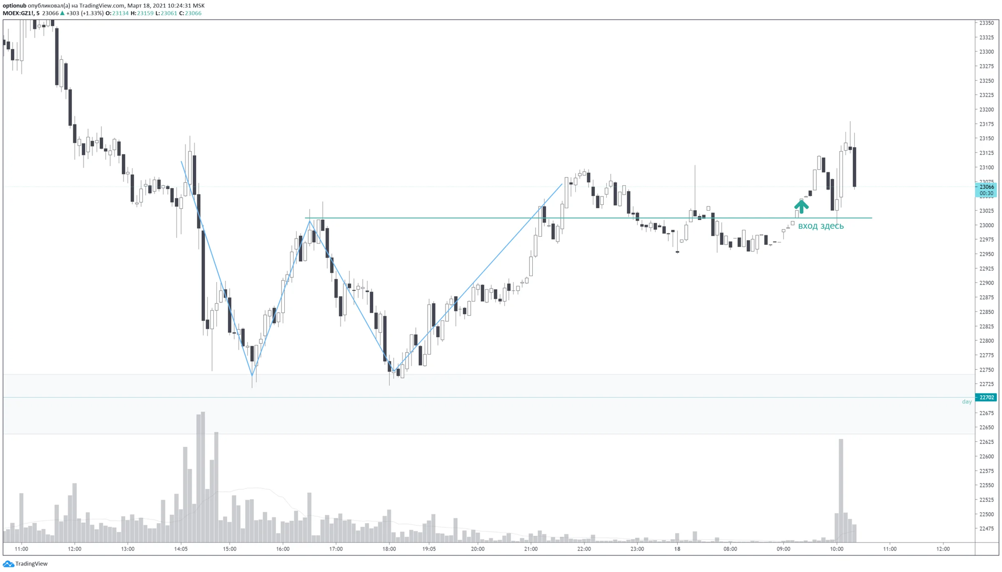 Идея такая. Рассмотрим лонг и разворот. Цена в нисходящем движении и пришла в зону покупок (важно). Я спускаюсь на 5 минут и смотрю на структуру движения. Мне нужно, чтобы начался новый тренд вверх с обновлением максимумов и минимумов, а так же, чтобы следующий максимум был выше ключевого уровня предыдущей нисходящей тенденции.