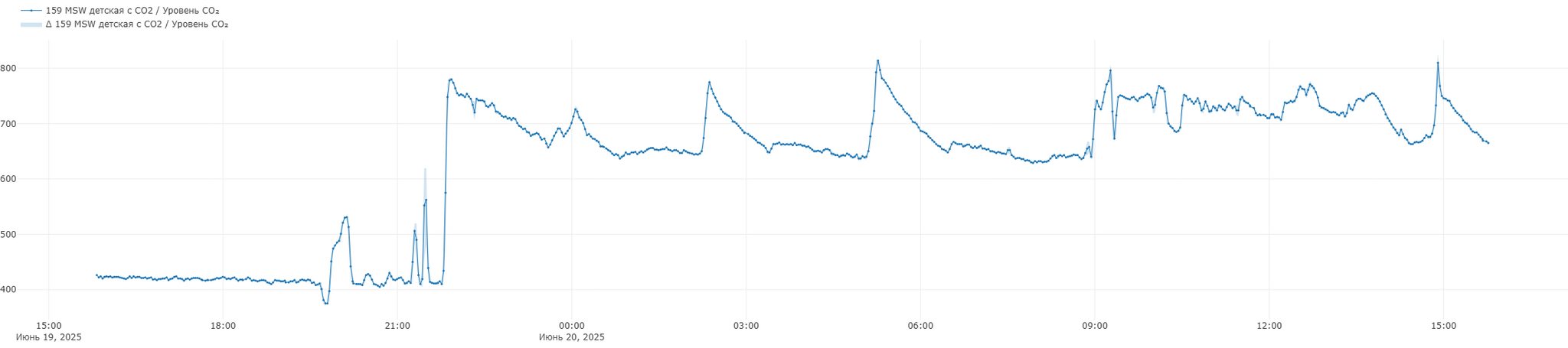 Видно, что уровень 700 ppm превышается, потому что от включения бризера до реального снижения уровня CO2 проходит некоторое время