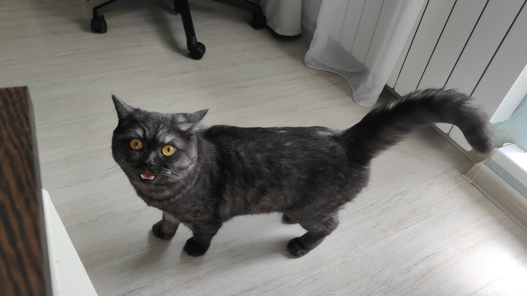 Сейчас он в руки не охотно идёт, но мы постоянно должны быть в поле его зрения. Когда уходим утром, а вечером приходим он ластится, мяукает, катается первые 5 минут, а потом вспоминает что он вообще-то центр нашей вселенной и начинает бесоебить и орать
