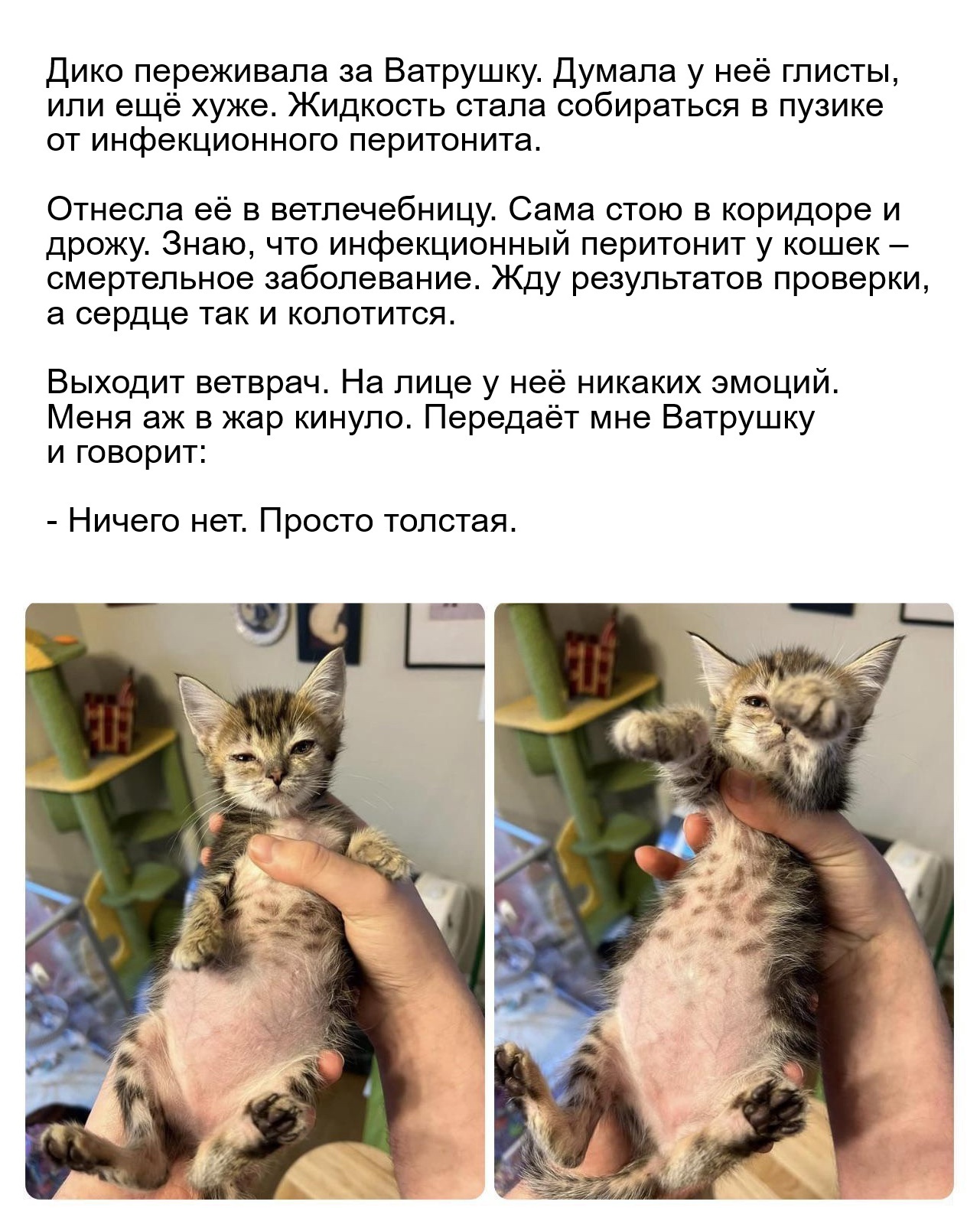 Повезло Вам. Мы тоже забрали осенью пузатую кошь с улицы. Оказалось, жидкость. За пару недель умерла. У меня есть пост про это, после его написания через день у меня на руках умерла. Прощалась со мной вот так
