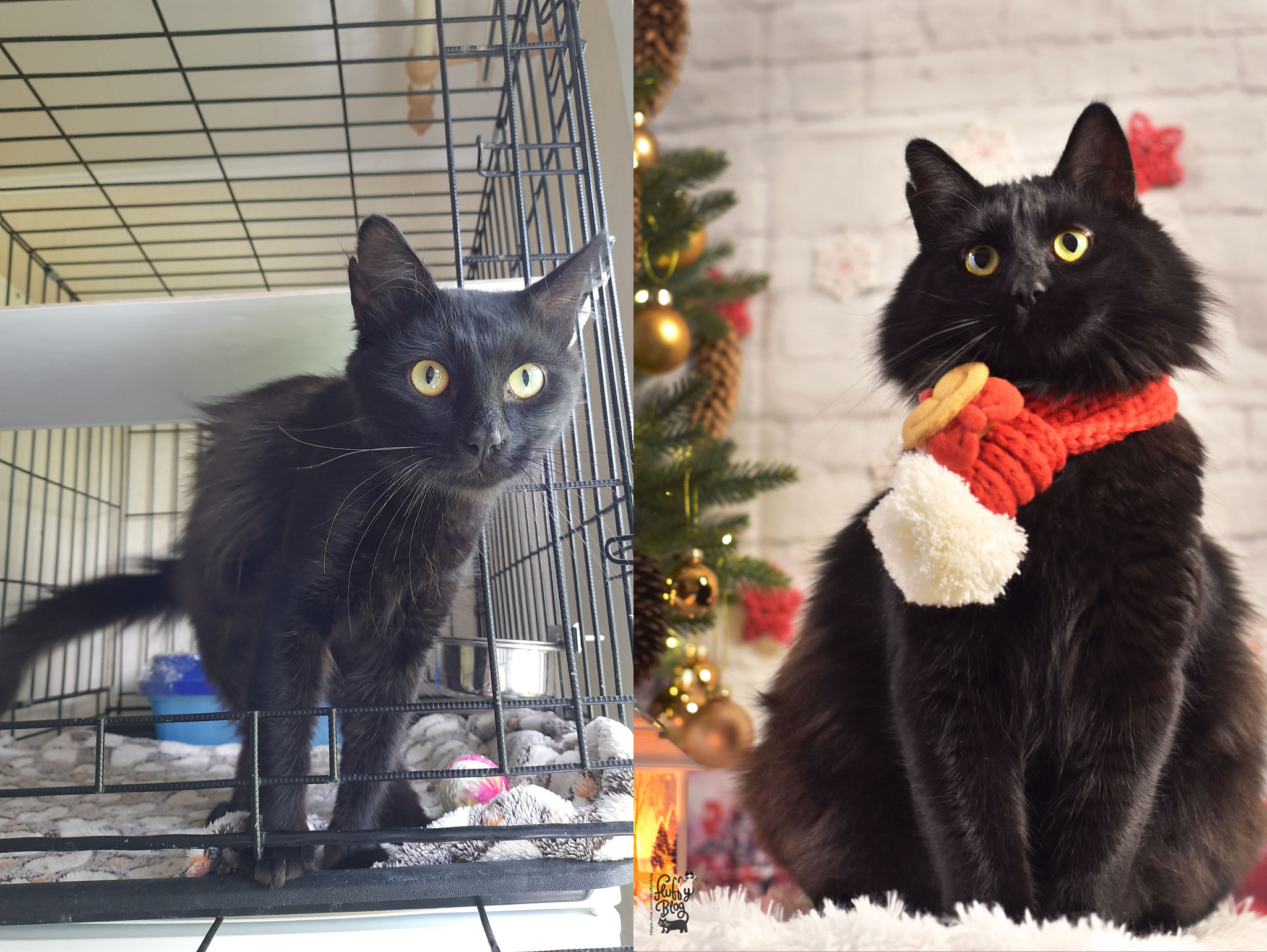 На фотографиях - коты с нашей передержки в момент, когда мы их подобрали, и на свежей предновогодней фотосессии.